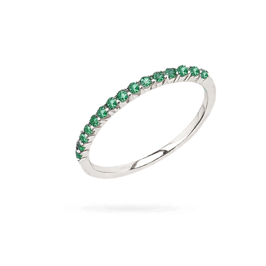 Елегантен пръстен от бяло злато с изумруди, създаден за жени с усет към изяществото и фината луксозна визия. Моделът впечатлява с изчистен и модерен дизайн, украсен с ред нежно фасетирани изумруди, които придават наситен зелен блясък и усещане за изтънченост. Перфектен избор за подарък, годеж, годишнина или специален момент, този пръстен символизира любов, хармония и ново начало. Подходящ е както за ежедневно носене, така и за елегантни поводи, като придава стил и класа на всяка визия.