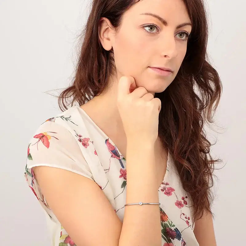 Сребриста гривна с бял циркон върху китка на модел, портрет.