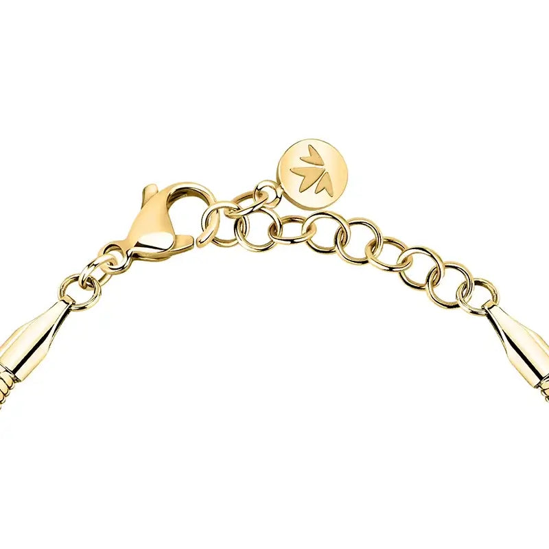 Фина гривна Morellato Gioia със златист блясък и три квадратни зелени циркона по 3×3 мм – свеж цветен акцент с елегантен профил. Основата е от медицинска неръждаема стомана със златно PVD покритие, което е по-устойчиво от стандартното галванично. Мека верижка тип „снейк“ ляга комфортно по китката; дължината се регулира от 16 до 19 см чрез удължител и сигурна карабинка. Лекото тегло ~3,88 г я прави идеална за ежедневно носене и комбинации със часовник или минимални гривни. Италиански минимализъм за свеж завършек на визията.