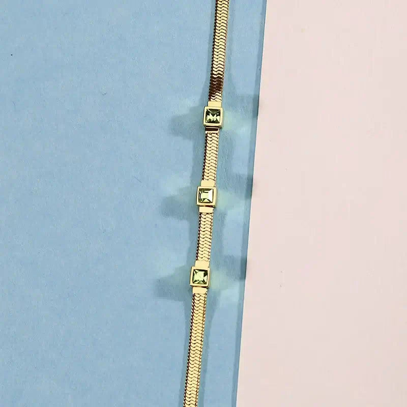 Лайфстайл кадър на гривна със зелени квадратни циркони върху цветен фон.