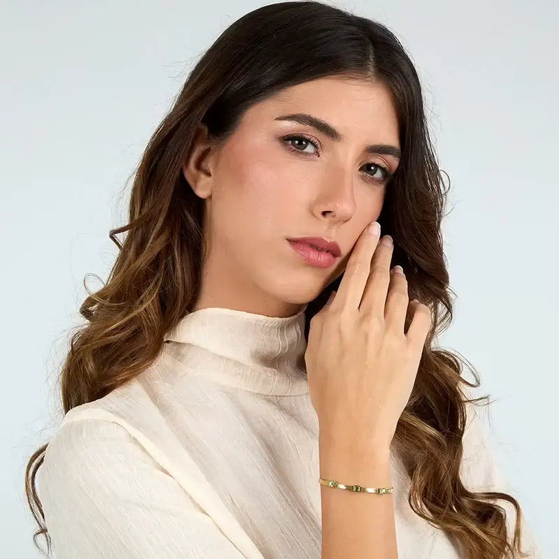 Близък план на златиста гривна със зелени циркони 3×3 мм на китка.