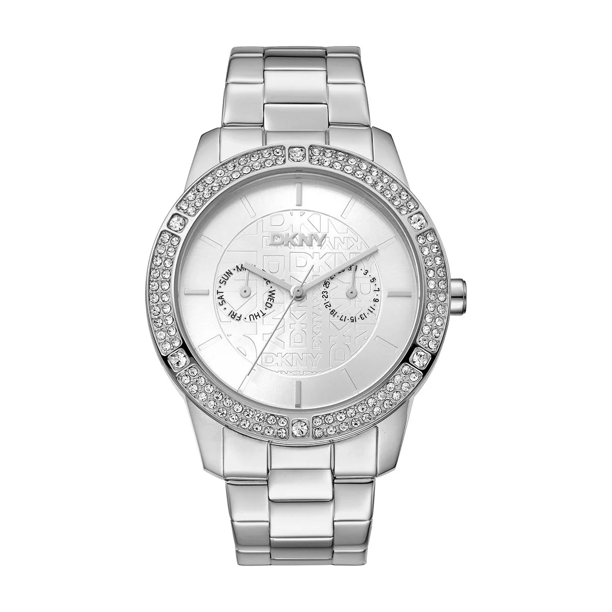 • Dial: silver with embossed DKNY logos, crystal bezel; day/date subdials