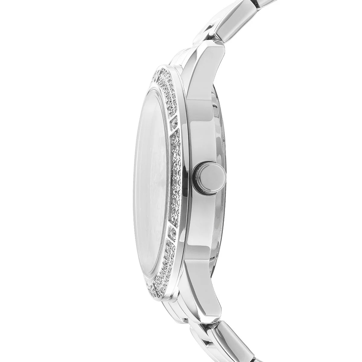Профил на дамски часовник DKNY Chambers Glitz – тънък сребрист корпус и безел с кристали, модел DK1L056M0035