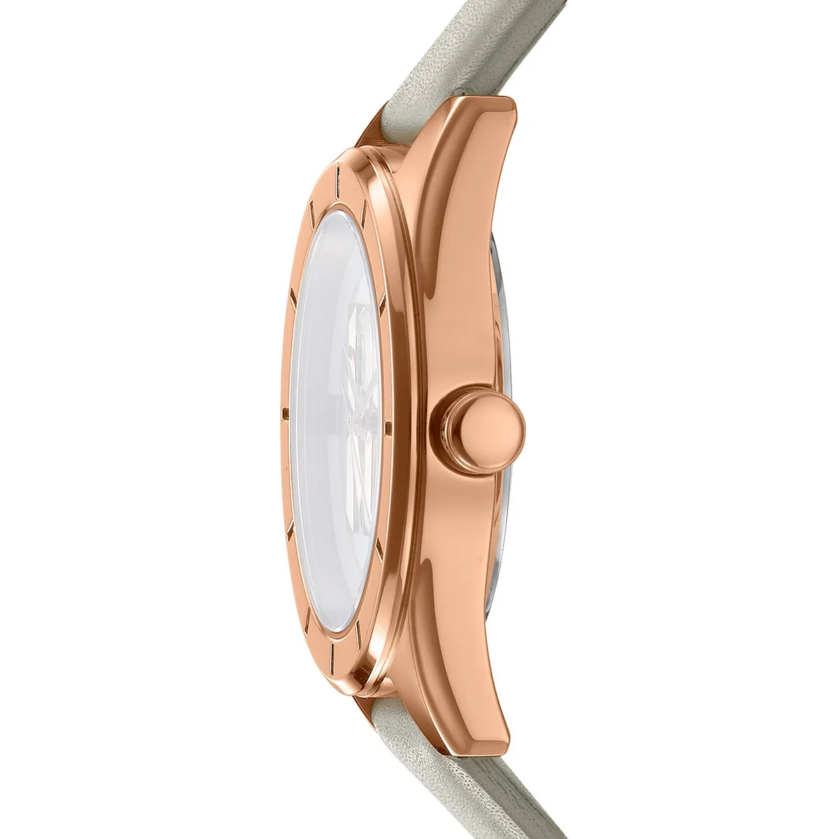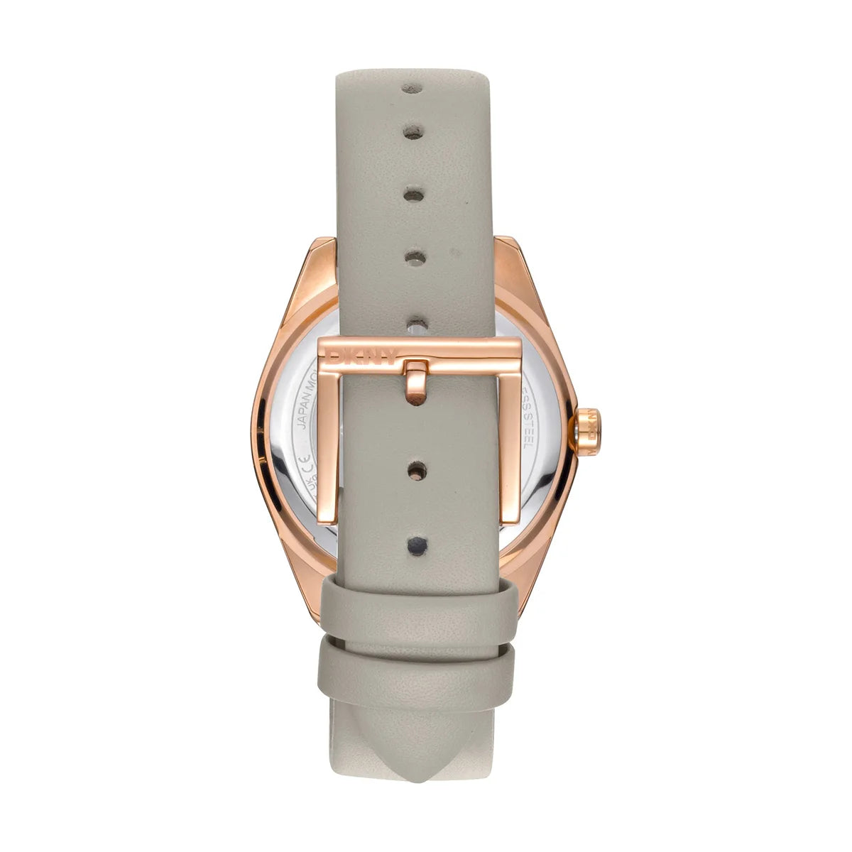Women's DKNY watch with logo dial combines pure New York style and jewelry elegance. The rose gold-tone stainless steel case with IP coating frames a silver-white dial with a raised DKNY logo. The soft gray leather strap fits comfortably and completes the modern look.