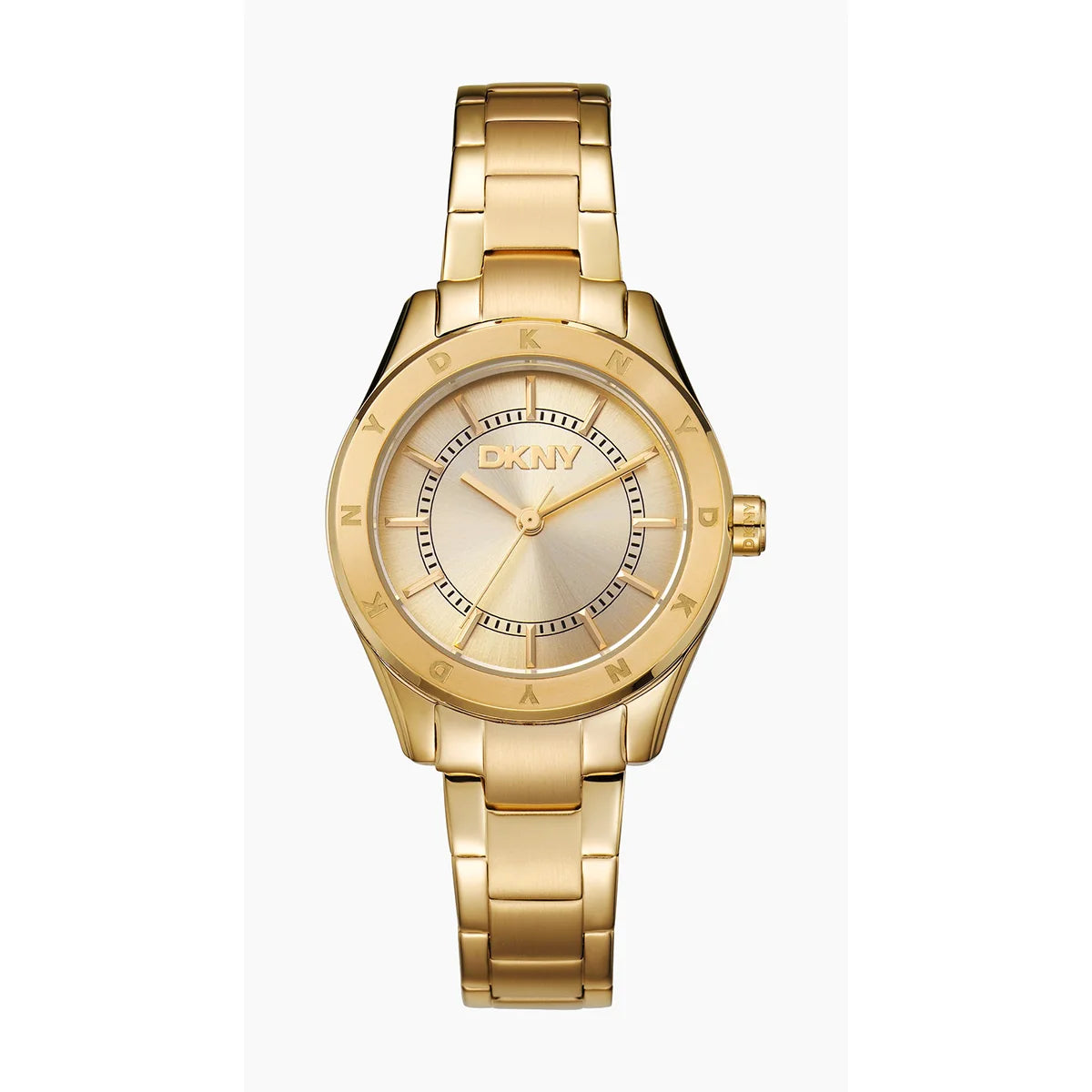 Elegant women's watch DKNY from the Chambers Sport line – a golden silhouette that brings New York chic every day. The compact 30 mm case and the clean champagne dial with three hands emphasize a modern, sophisticated look.