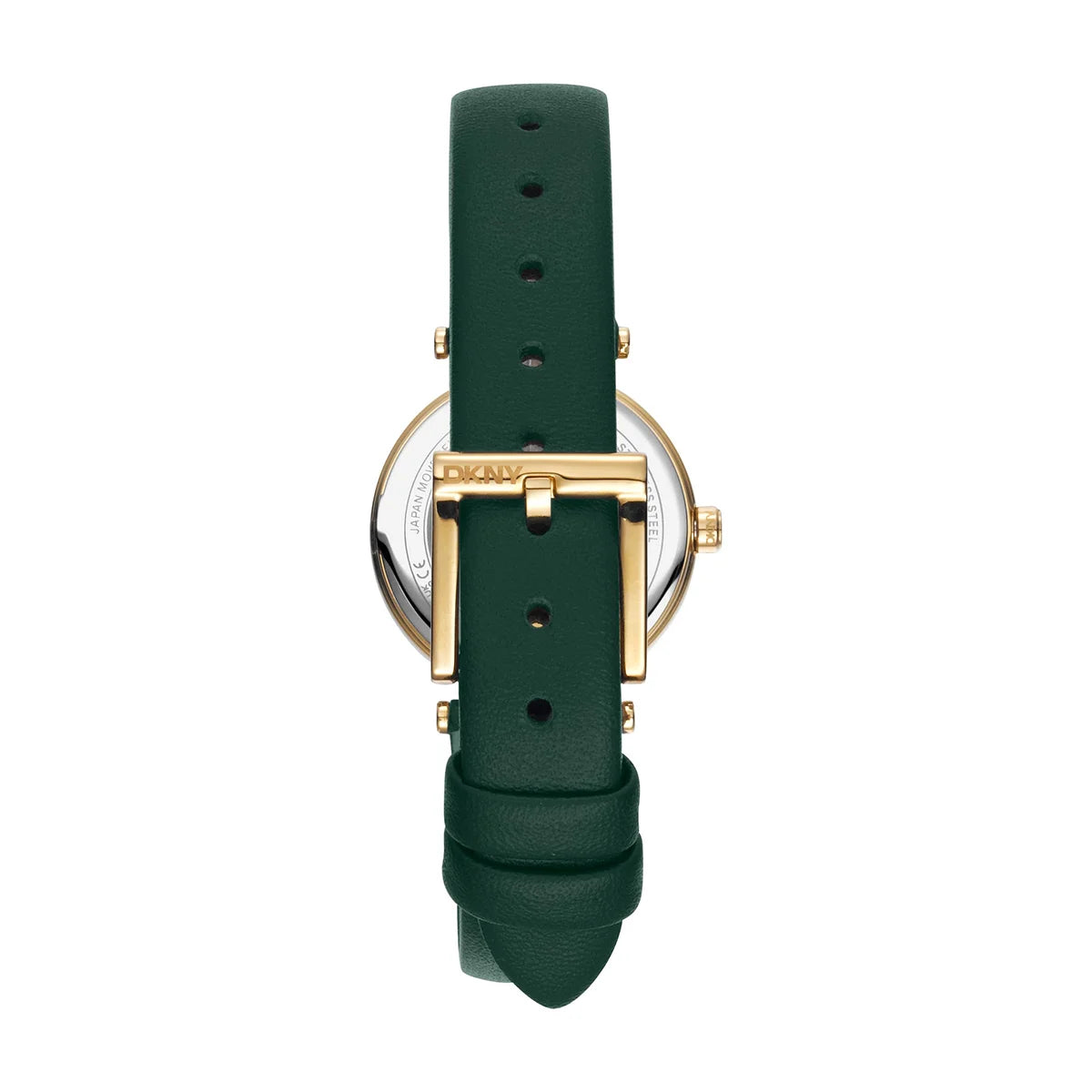 Дамски часовник DKNY Essential Mini, златист корпус, сребрист циферблат и тъмнозелена кожена каишка – часовник DKNY модел DK1L043L0025