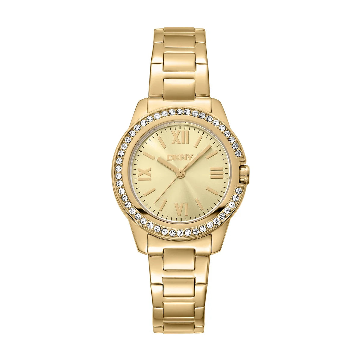 Дамски часовник DKNY Evening, златиста стомана с кристален безел и шампански циферблат 30 мм – часовник DKNY модел DK1L105M0055