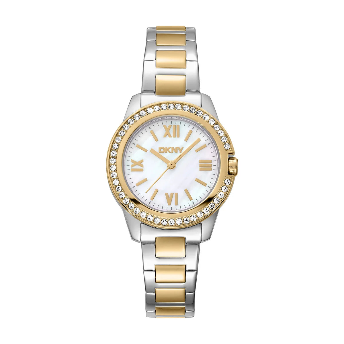 DKNY Evening Women's Watch brings New York sparkle in a compact size. Bicolor stainless steel with IP coating (silver/gold) wraps an exquisite pearl (Mother-of-Pearl) dial with Roman numerals, and the thin crystal bezel adds an elegant finish.