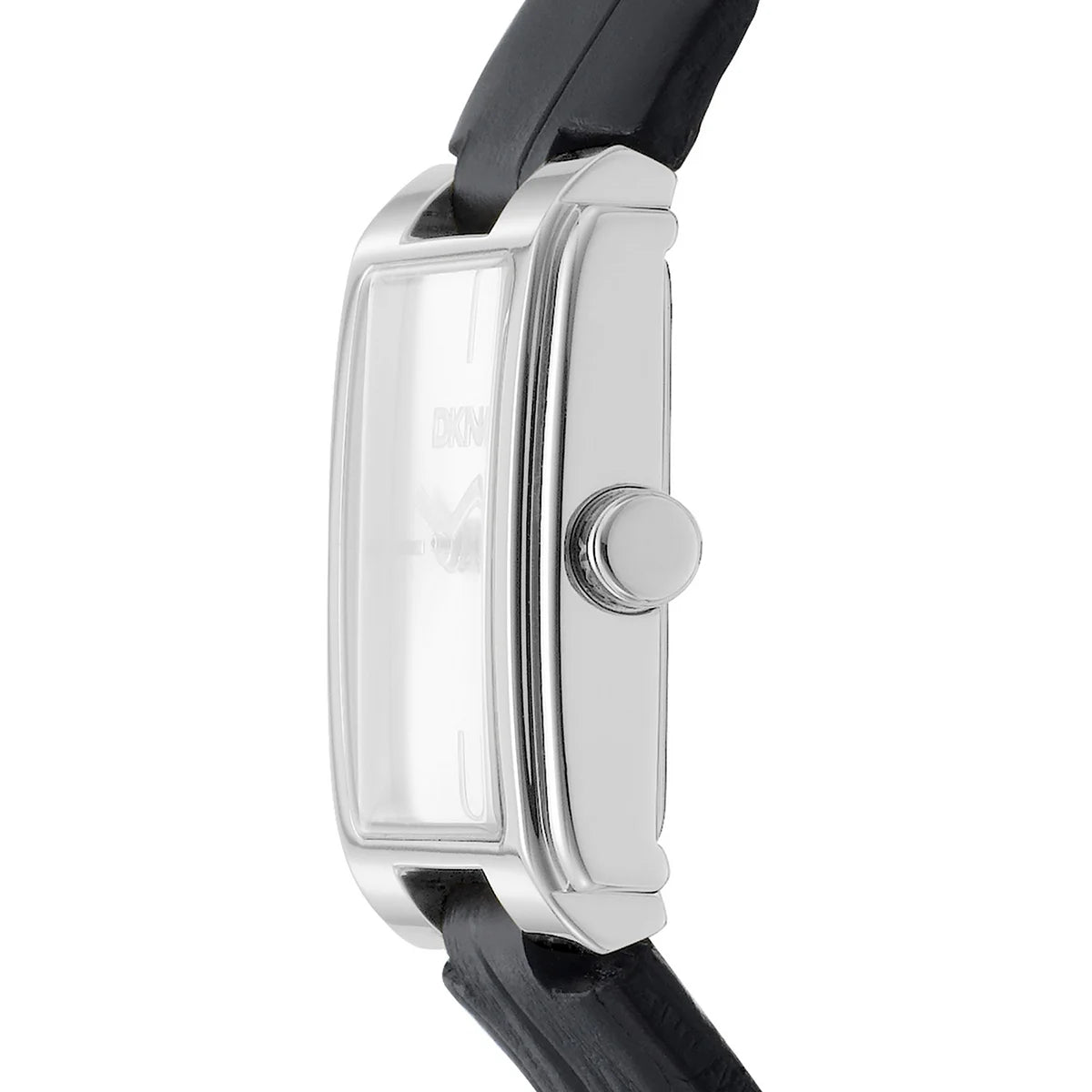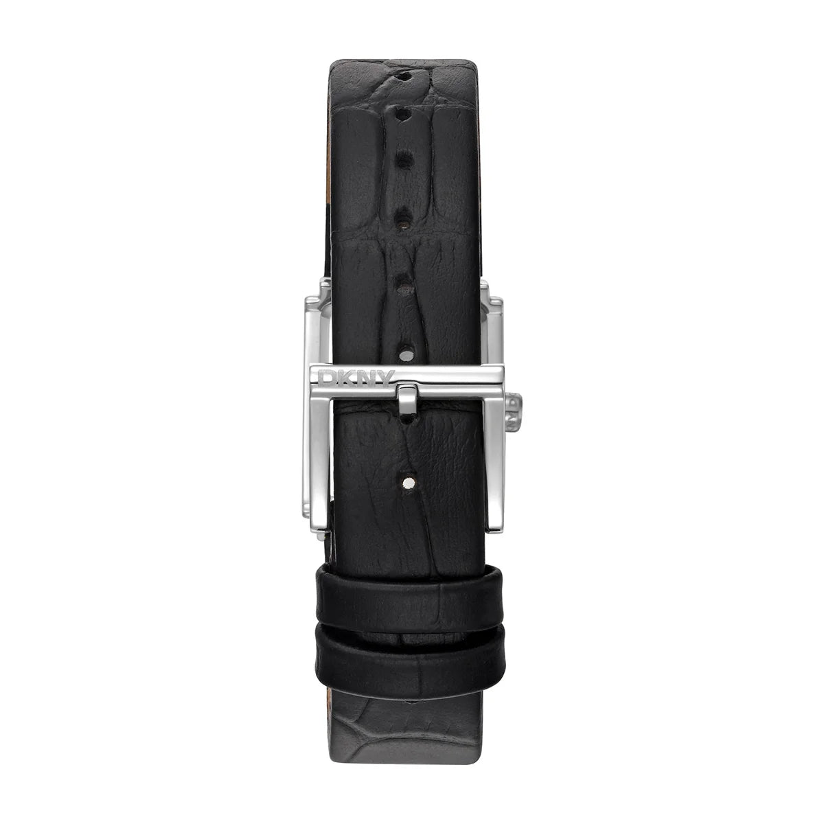 Дамски часовник DKNY Everyday, правоъгълен 23×30 мм, черна кожена каишка и сребрист циферблат – модел DK1L121L0015