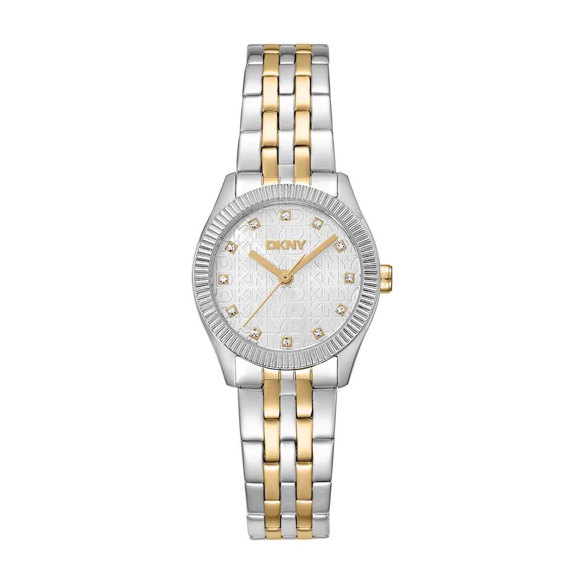 Women's DKNY watch with a fluted bezel and elegant two-tone steel (silver/gold). The gray dial with embossed DKNY monogram and gold markers gives a jewelry-like appearance – subtle but memorable.