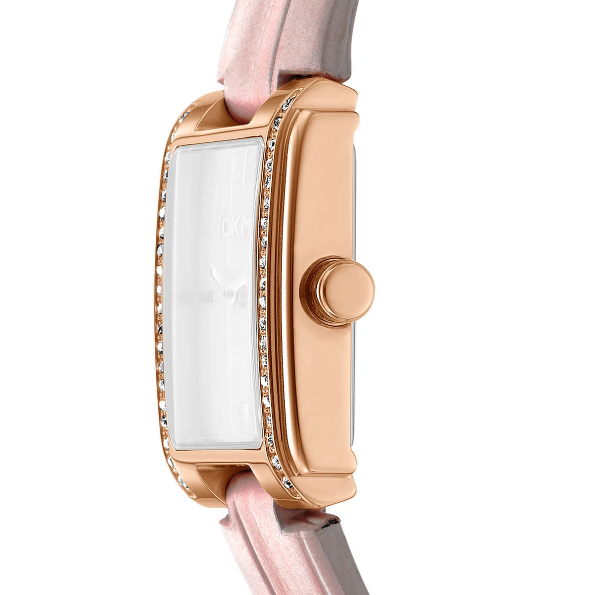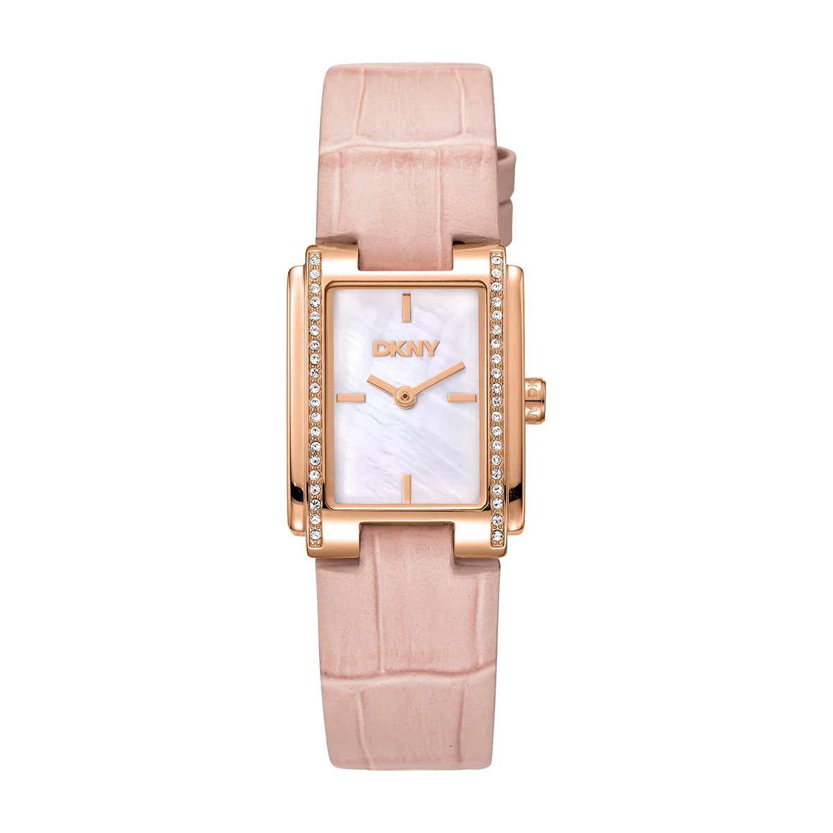 Дамски часовник DKNY, правоъгълен 23×30 мм, розовозлатист корпус, седефен циферблат и розова кожена каишка – модел DK1L122L0025