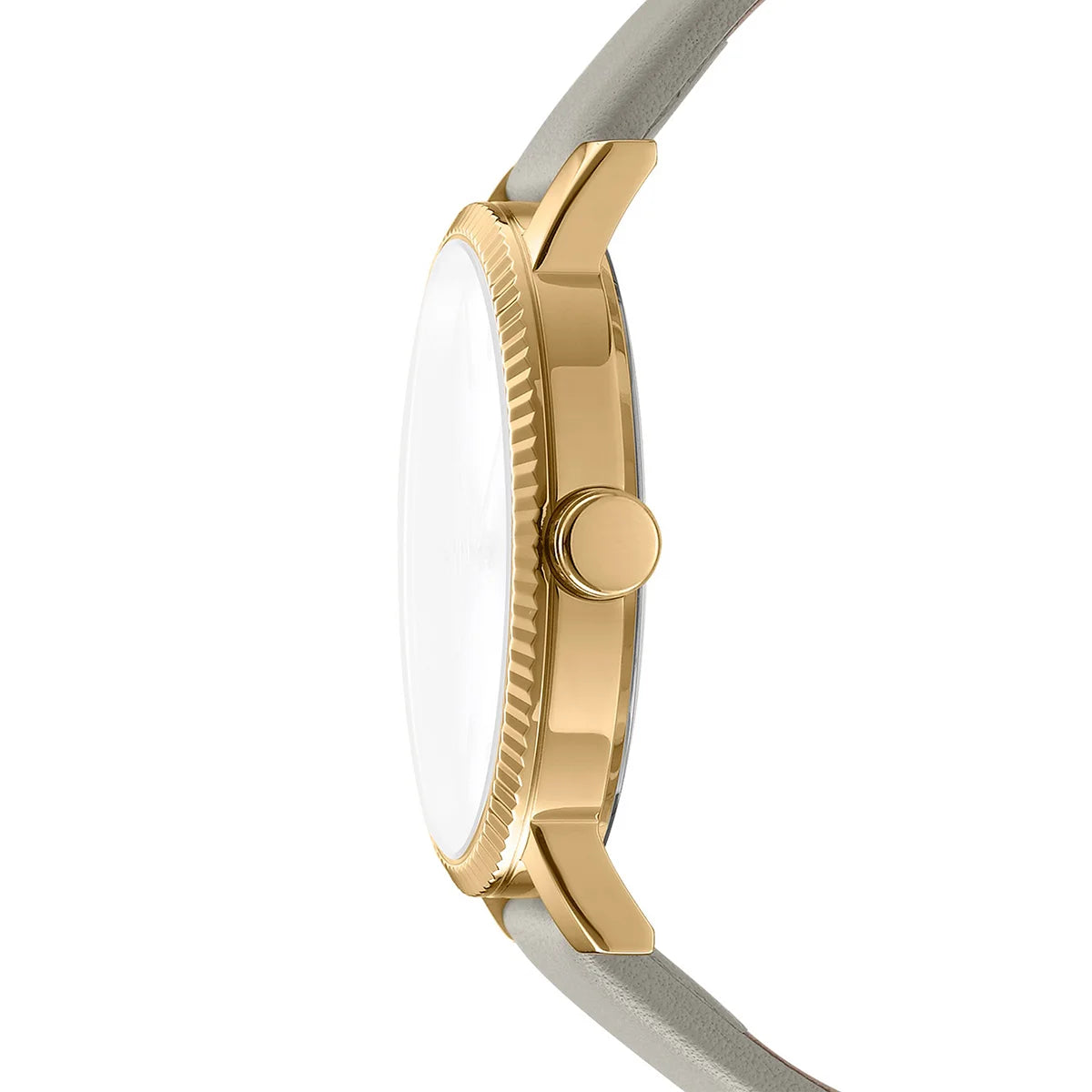 Elegant women's watch DKNY, inspired by New York minimalism. Soho Maxi combines a gold-tone case and a silver sunray dial with fine index markers for a modern yet understated look. The soft gray leather strap adds comfort and easily transitions from office to evening.