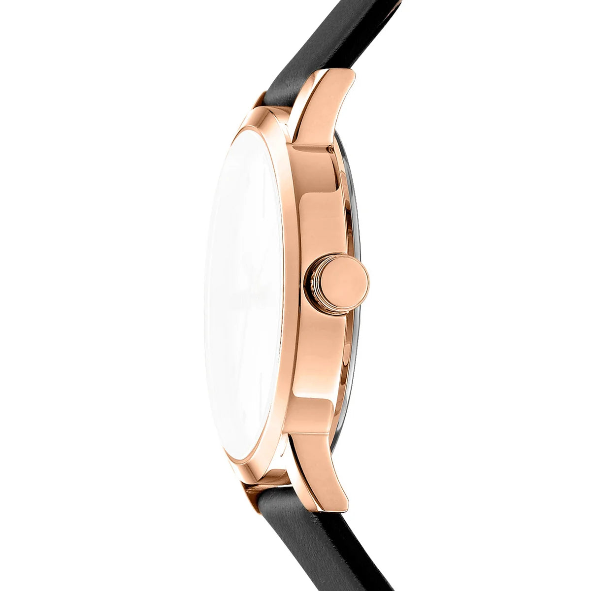 The case is made of stainless steel with IP rose gold coating – wear-resistant and maintaining shine during use. Under a sturdy mineral glass works a reliable Seiko VJ32 quartz movement with three hands and calendar. The black leather strap is soft, comfortable, and easy to combine from office to evening outing.