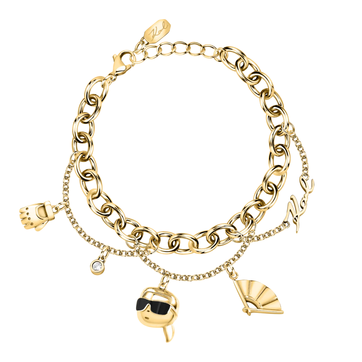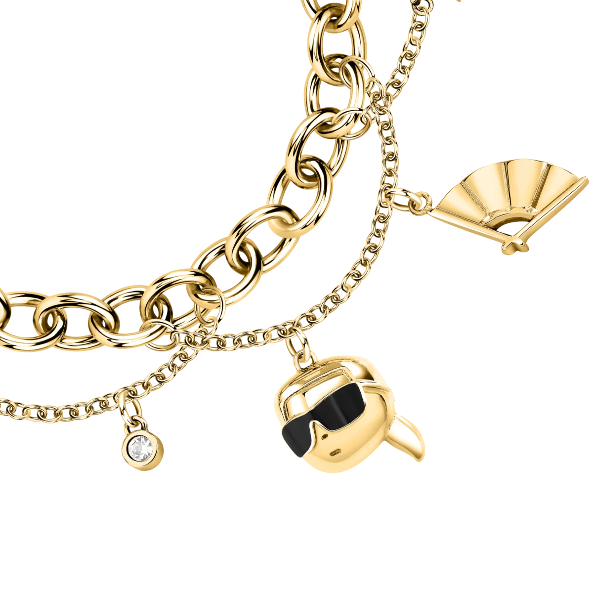 Елегантна златиста гривна Karl Lagerfeld с висулки глава с очила, ръкавица, ветрило и кристал – модел KLAYD11, детайлен близък план
