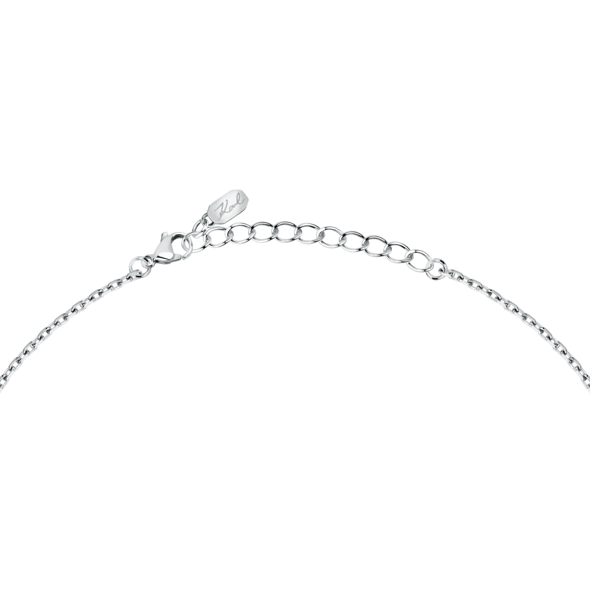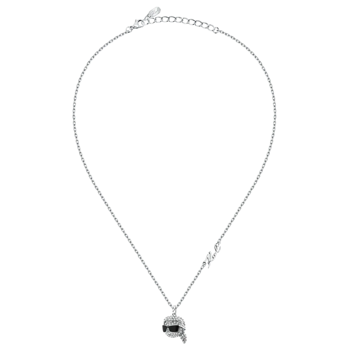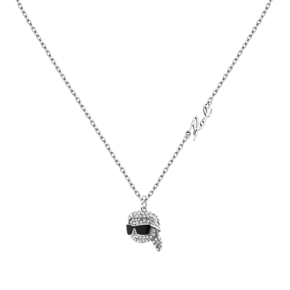 Миниатюрната глава с очила е покрита с искрящи бели кристали, а черните очила са подчертани с контрастен емайл за характерен графичен ефект. По веригата е поставен и емблематичният надпис „Karl“, който добавя фин моден акцент, без да натоварва стила.