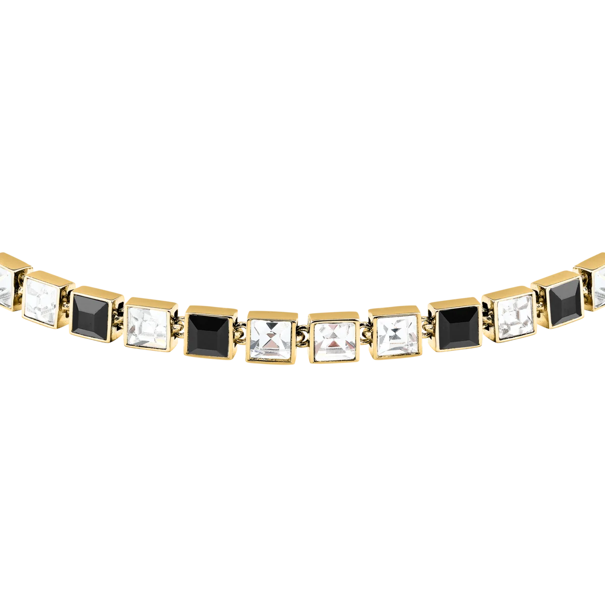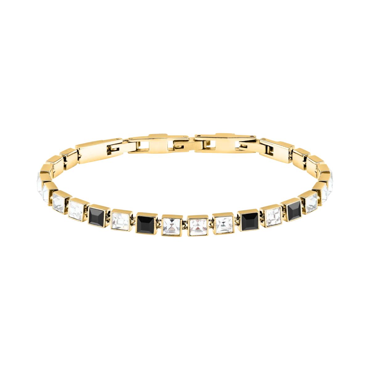 Изчистена линия и силен контраст – тази дамска тенис гривна от колекцията Karl Lagerfeld Crystals превръща всеки жест на китката в модерно модно изявление. Редуващи се бели и черни кристали са вградени в фини квадратни касети и образуват сияеща линия по цялата обиколка.