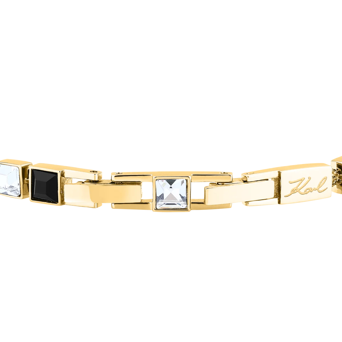 Гривната е изработена от неръждаема стомана 316L със златисто PVD покритие, което запазва цвета и блясъка за дълго и е устойчиво на износване. Полираният метал подчертава наситения цвят на кристалите и придава усещане за бижу от високата бижутерия. На едно от звената е гравиран характерният подпис Karl, който фино подсказва за дизайнерския произход.