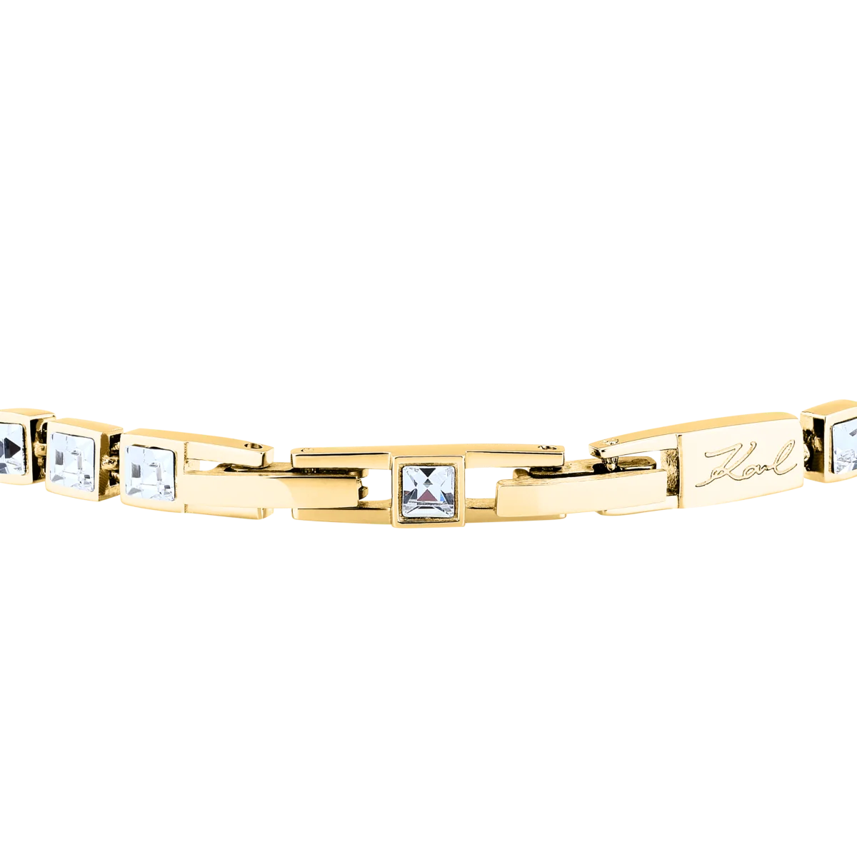 Гривната е изработена от неръждаема стомана 316L със златисто PVD покритие, което запазва цвета и полирания гланц за по-дълго и е устойчиво на надраскване. Всяко звено е внимателно оформено като малка квадратна рамка, в която е вграден фасетиран кристал – типичен за линията Crystals баланс между модерен геометричен дизайн и женствено излъчване. На едно от звената е гравиран характерният подпис Karl, който добавя фино дизайнерско присъствие.