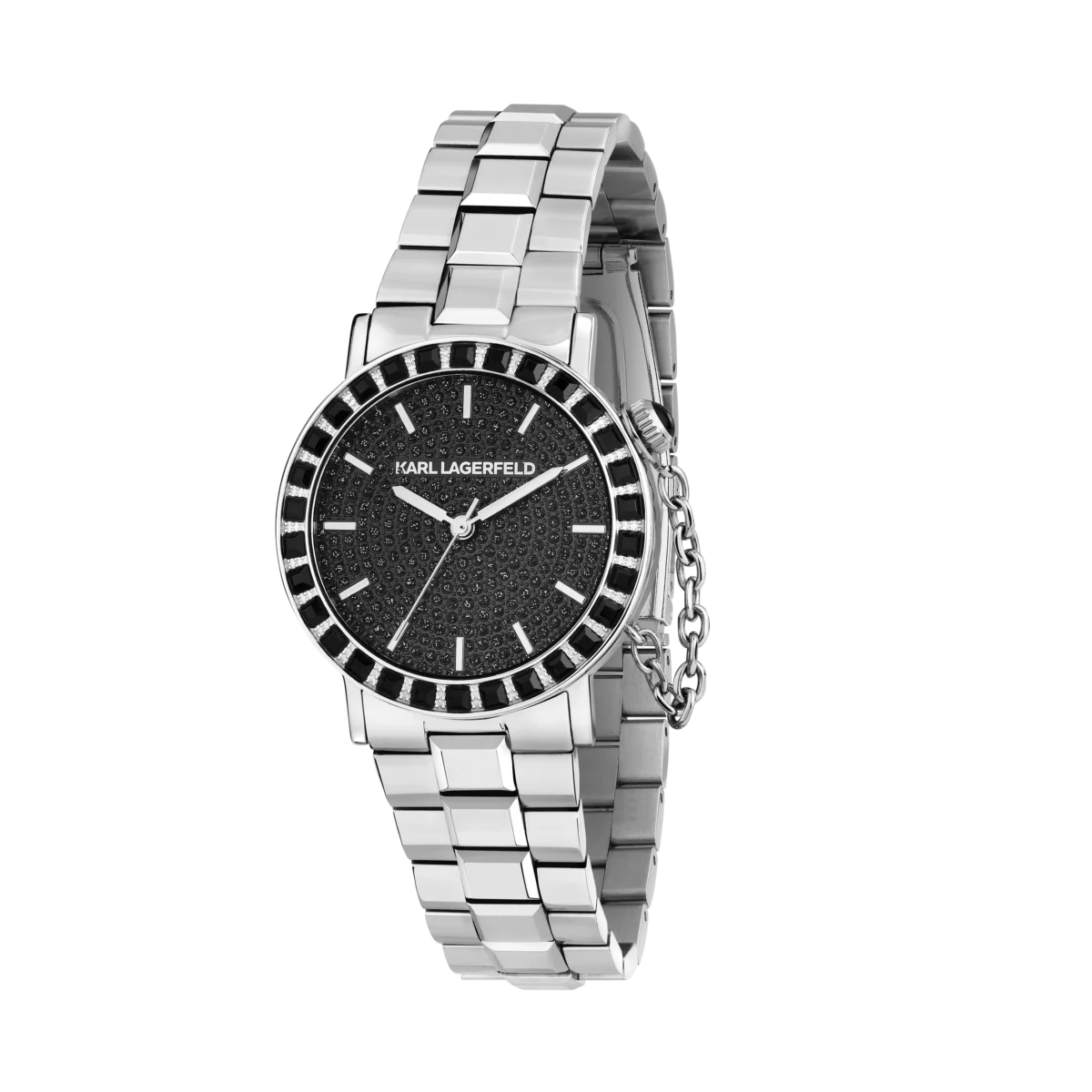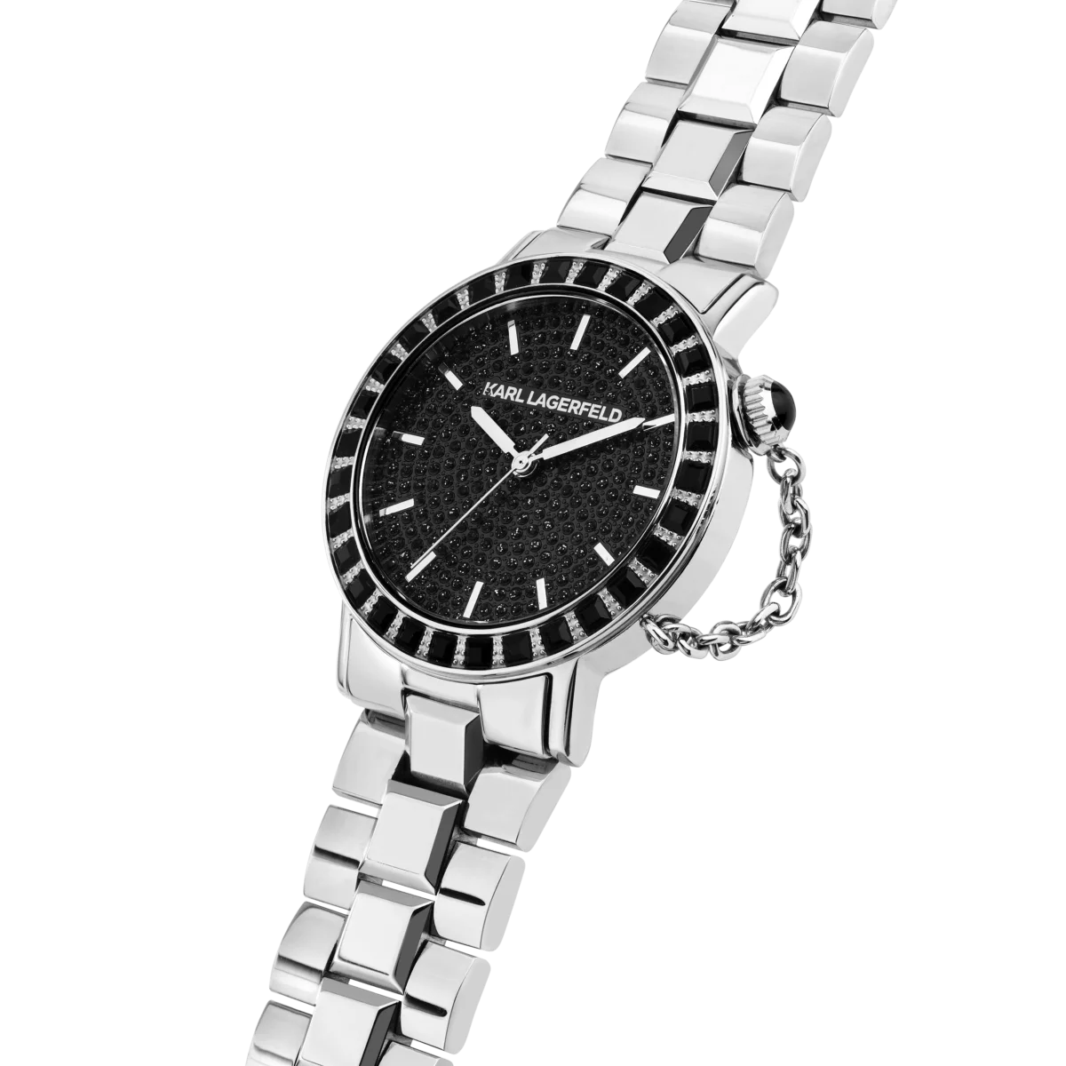 Корпусът с диаметър 33 мм е изработен от полирана неръждаема стомана, защитен с минерално стъкло. Безелът е обсипан с правоъгълни черни камъни, а тясната верижка с вързана към корпуса декоративна верижка придава бижутерски характер. Всичко това носи разпознаваемия стил на Karl Lagerfeld.