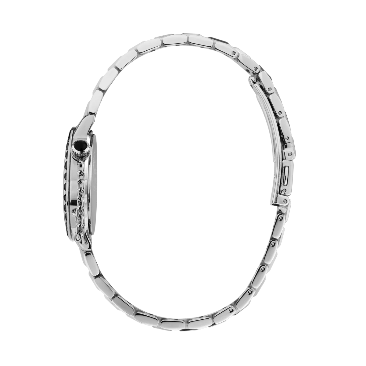 Луксозният дамски часовник Karl Lagerfeld Crystals е създаден за силно градско излъчване. Кръглият черен циферблат с ефект diamond dust и черни кристали привлича светлината като вечерно небе, а сребристата стоманена верижка стои на китката като модерна гривна.