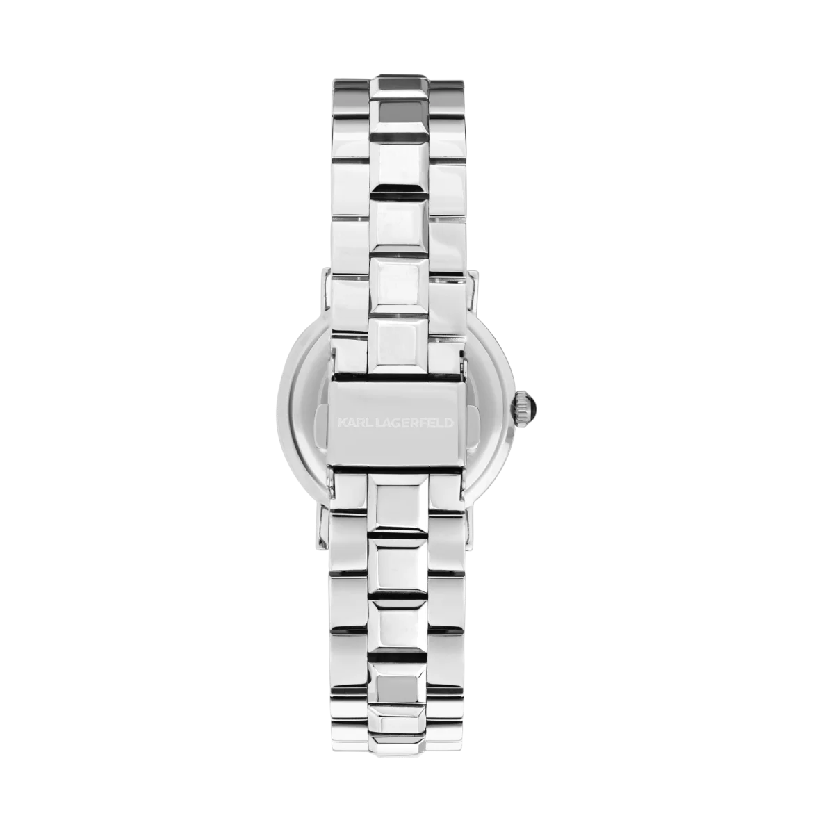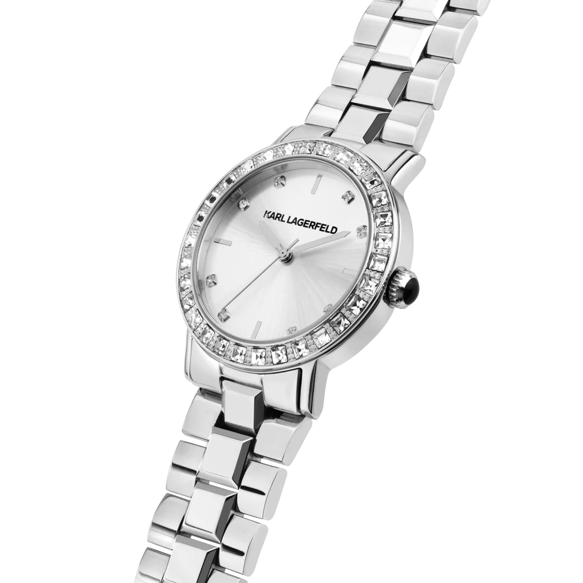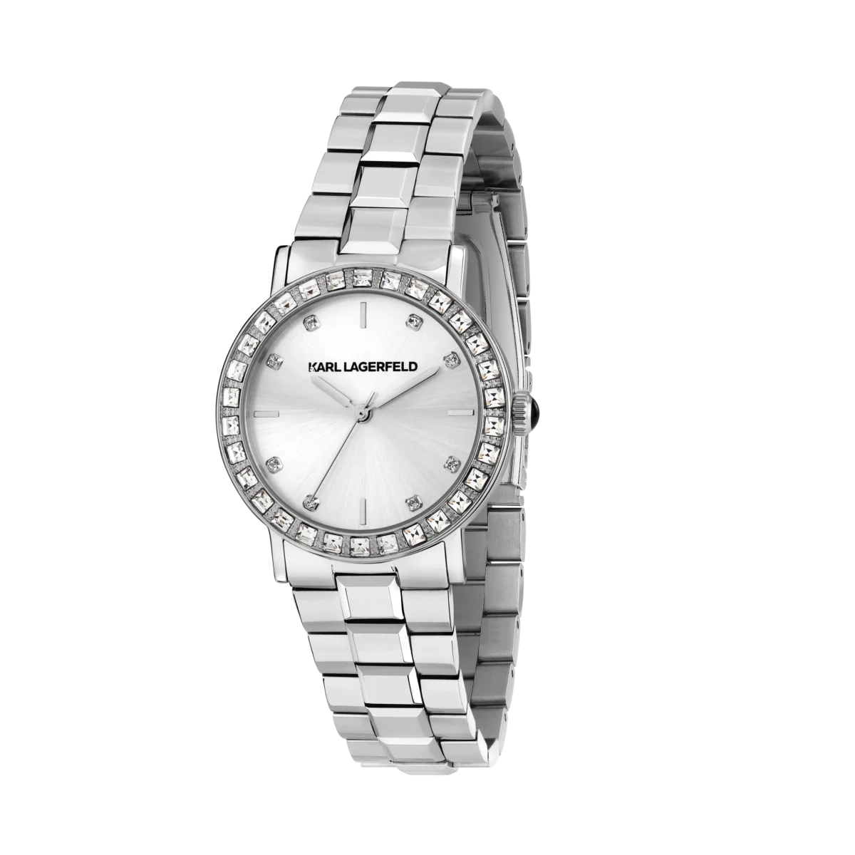Изчистен, но безспорно бляскав – този дамски часовник Karl Lagerfeld Crystals превръща всеки аутфит в модно изявление. Сребристият sunray циферблат е обграден от ред едри прозрачни кристали по безела, а компактният корпус от 33 мм стои като фино бижу върху китката.
