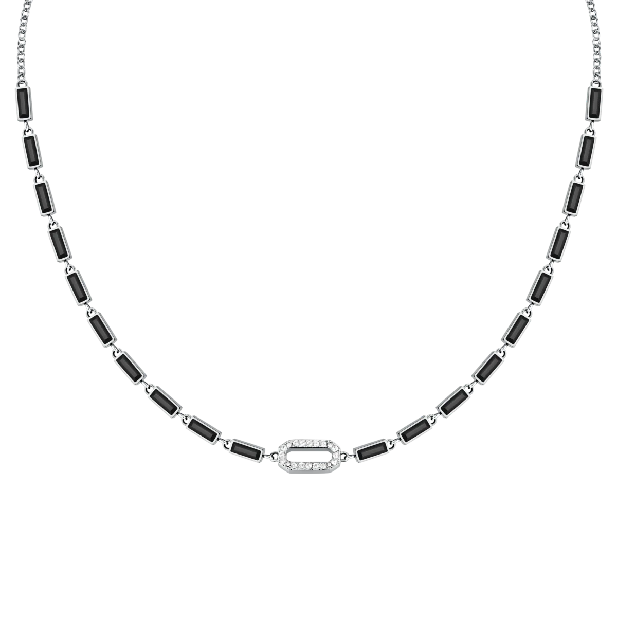 Колиѐто е изработено от полирана неръждаема стомана 316L в сребрист тон, известна със своята устойчивост и хипоалергенни свойства. Италианските каталози описват модела като стомана с родиево покритие, което запазва цвета и блясъка му по-дълго и предпазва повърхността от потъмняване. Багетните черни кристали и кръглите бели камъни създават контраст, който стои еднакво добре както върху гола кожа, така и върху бяла риза или черна рокля.