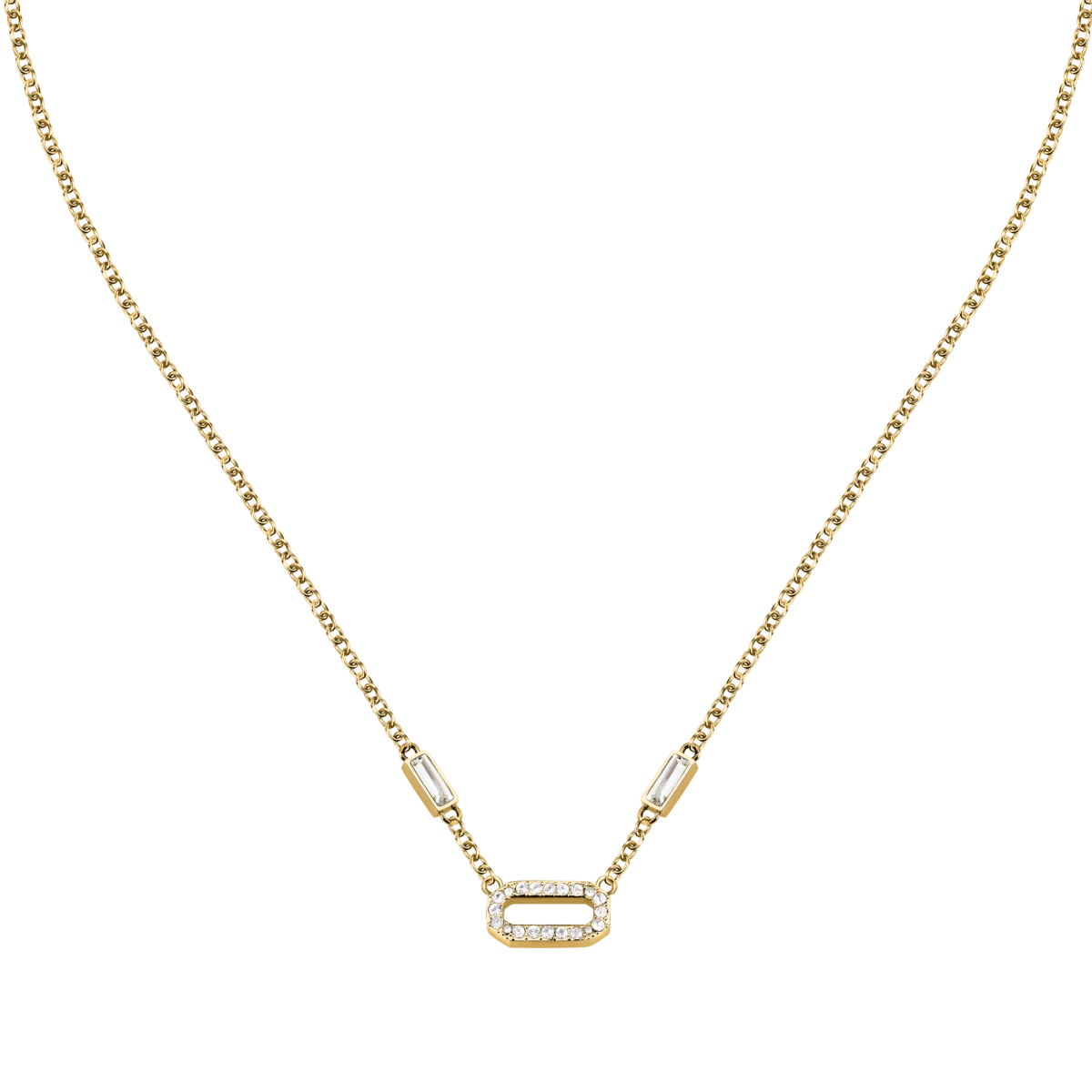 Нежно, но с характер – това дамско колие Karl Lagerfeld Crystals е създадено да добави фин блясък към всяка визия. Фина златиста верижка обгръща деколтето, а в центъра сияе правоъгълен елемент, обсипан с бели кристали, рамкиран от две издължени багетни камъчета.