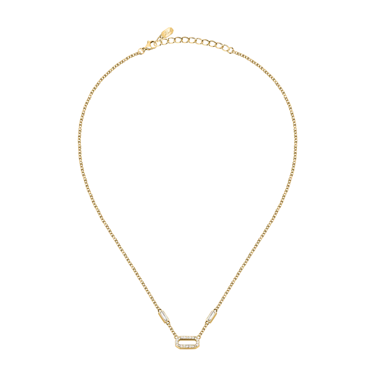 Колиѐто е изработено от неръждаема стомана 316L с PVD покритие в цвят жълто злато, което осигурява устойчивост на износване и запазва блясъка за дълго. Кристалите са внимателно вградени в правоъгълни каси, а деликатната верижка с малки „пирамидални“ звена придава модерен, графичен силует. Това е универсален аксесоар – достатъчно изчистен за офиса и достатъчно блестящ за вечерни излизания.
