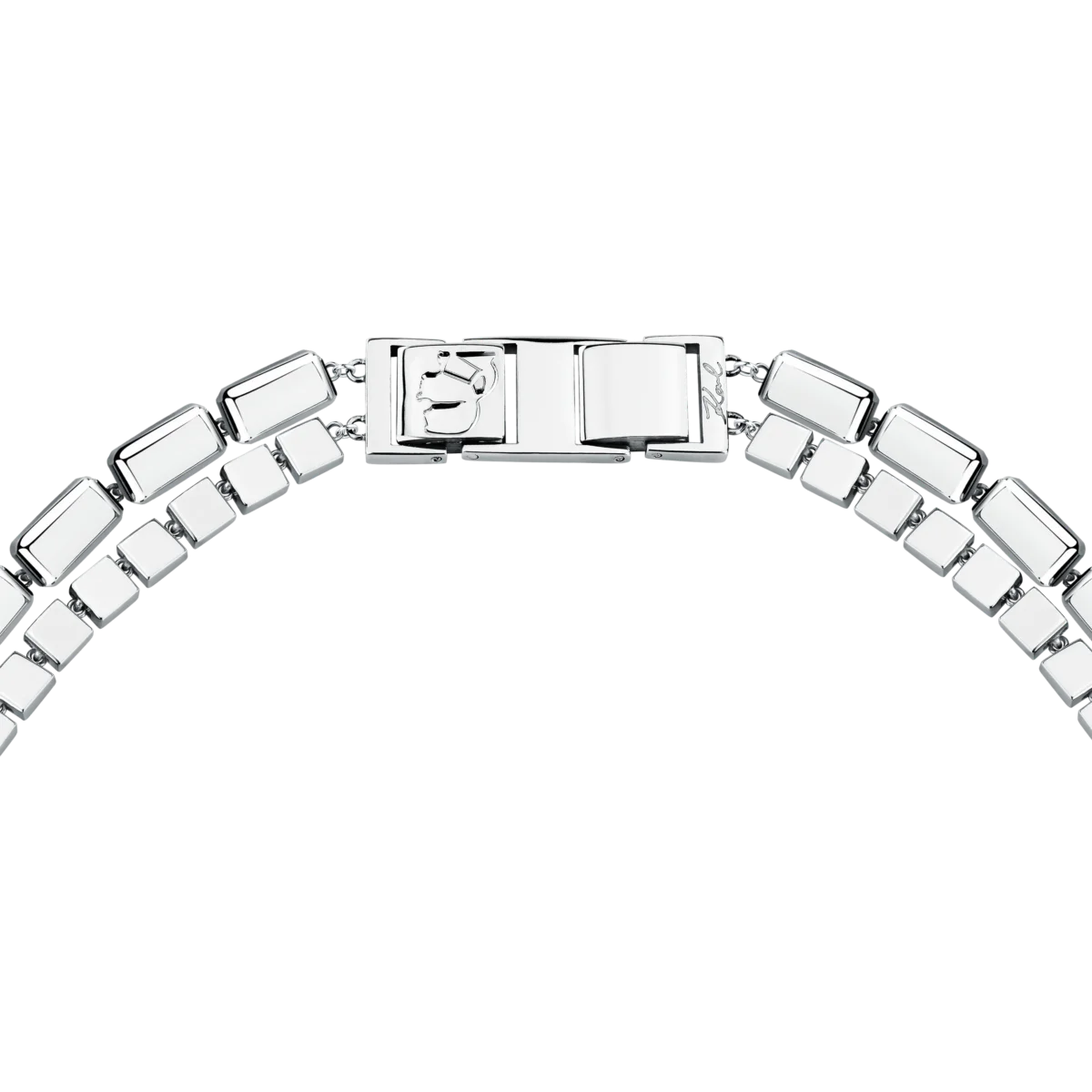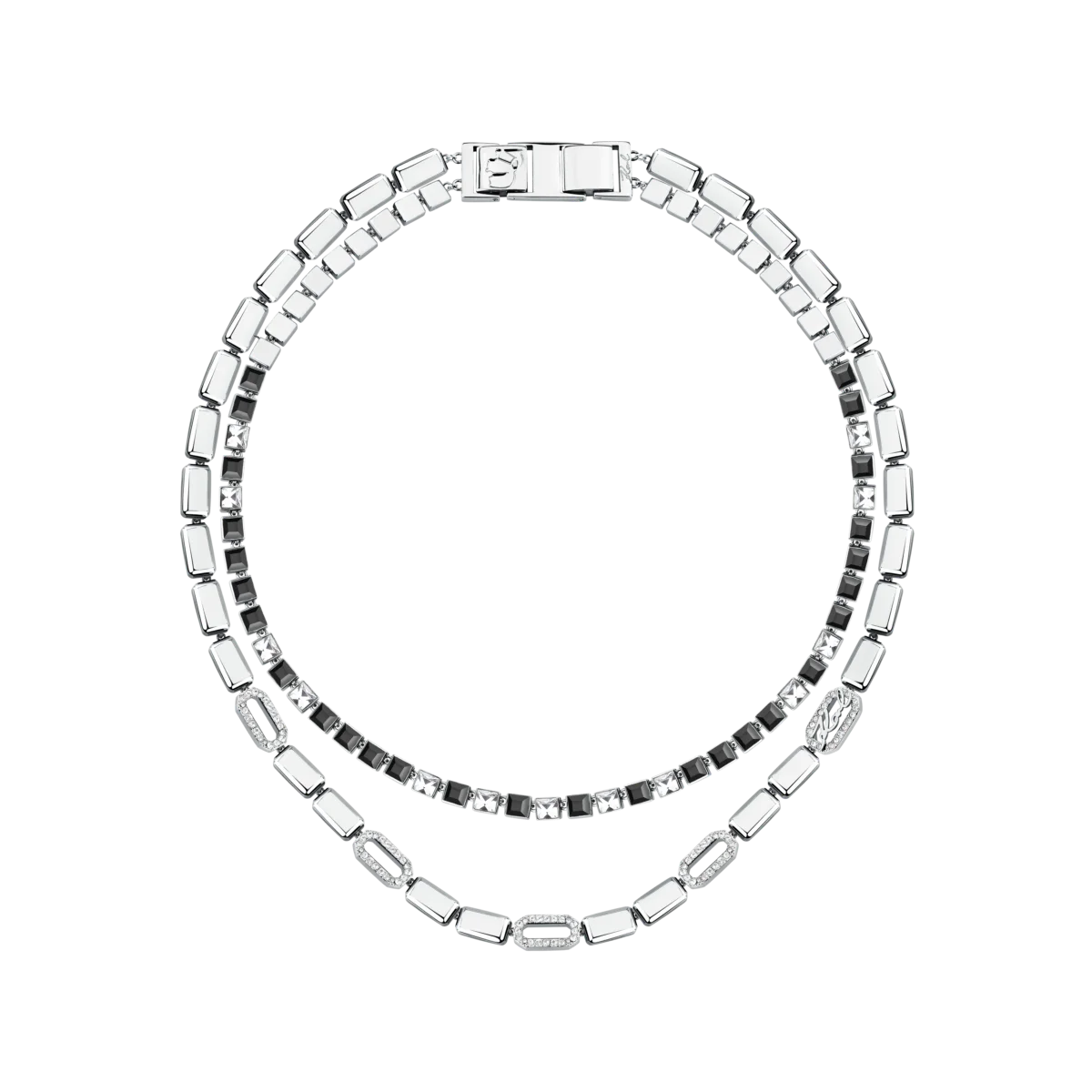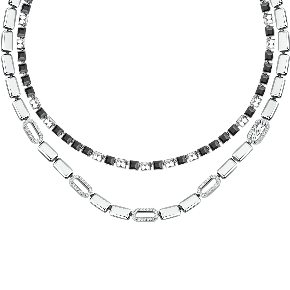 Това изразително дамско колие с кристали от колекцията Karl Lagerfeld Crystals е създадено за силно градско излъчване. Дизайнът с двоен ред комбинира правоъгълни метални елементи и редица от черни и бели кристали, които обгръщат шията като модерна верига.