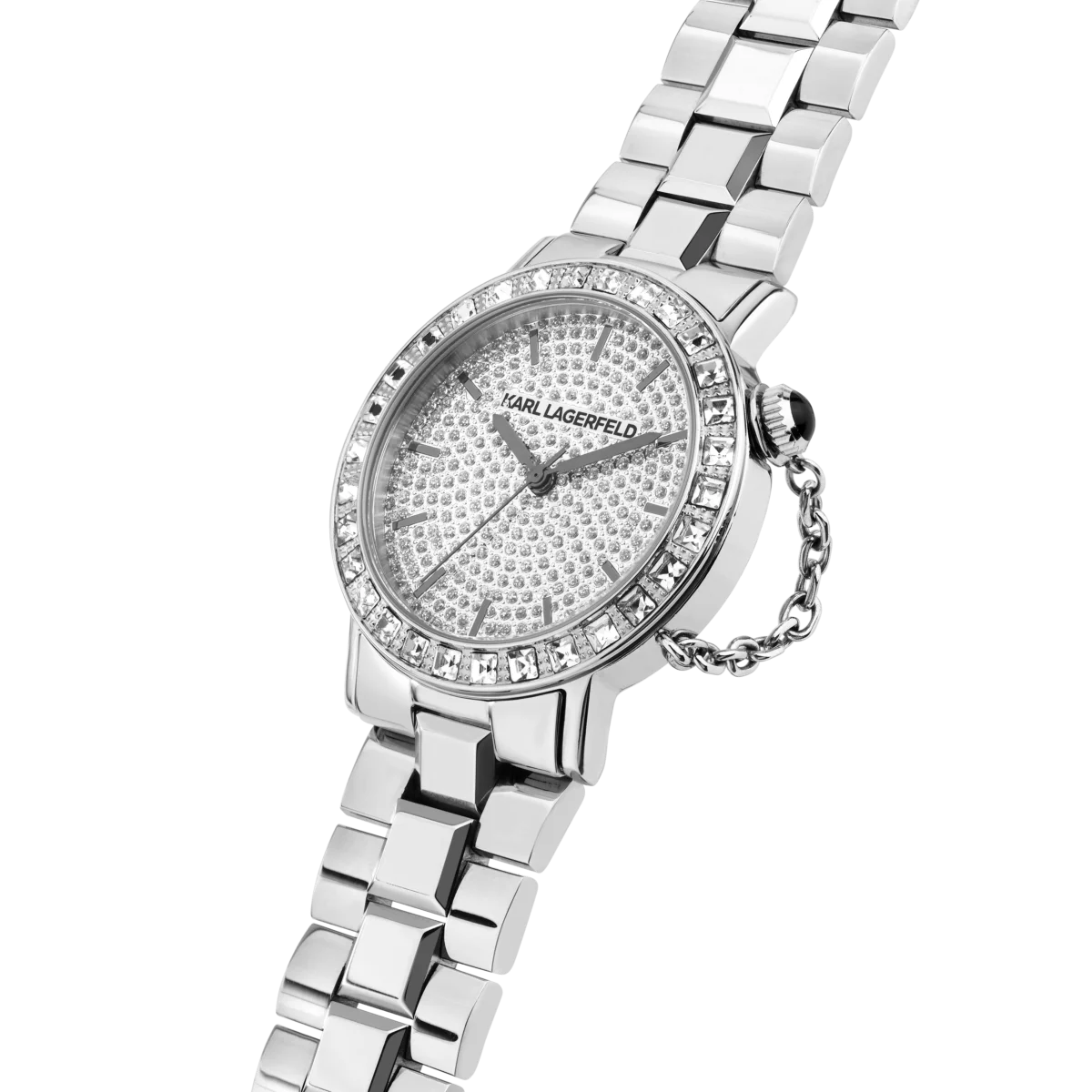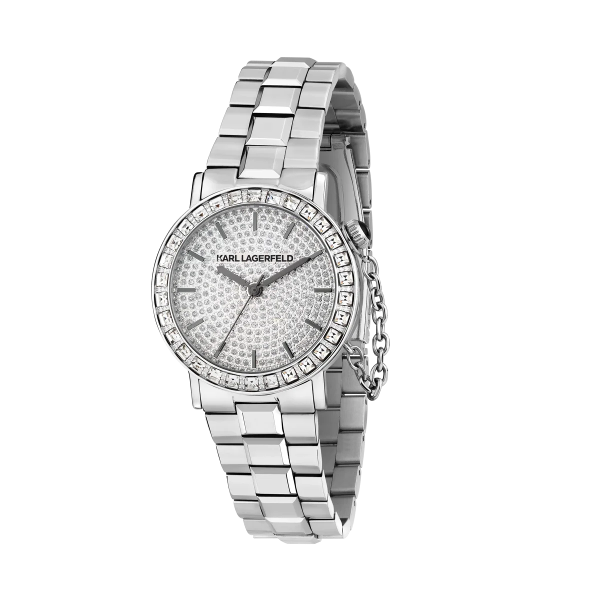 Дамски часовник Karl Lagerfeld Crystals е създаден за жени, които обичат силния блясък и модните детайли. Кръглият корпус с диаметър 33 мм и изцяло обсипаният с кристали сребрист циферблат превръщат модела в истинско бижу за китката. Двуредният безел с прозрачни камъни и характерната декоративна верижка до коронката подчертават луксозния дизайнерски стил на Karl Lagerfeld.