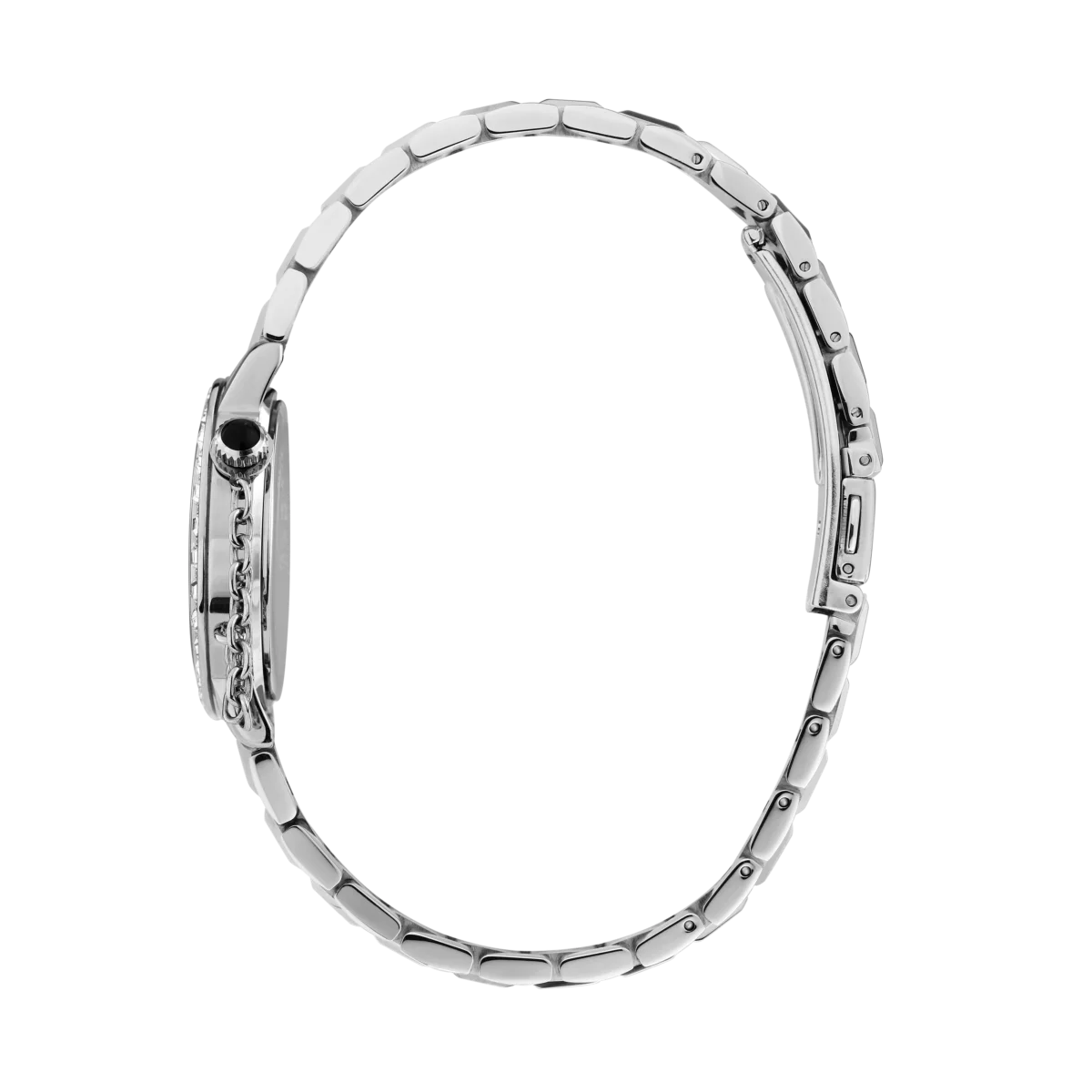 Корпусът и верижката са изработени от висококачествена неръждаема стомана с полирано сребристо покритие, което запазва блестящия си вид дълго време и е щадящо към кожата. Минералното стъкло защитава циферблата от ежедневни надрасквания, а стоманената верижка с разгъваща се закопчалка с бутони се регулира лесно по дължина, за да пасне идеално на китката.