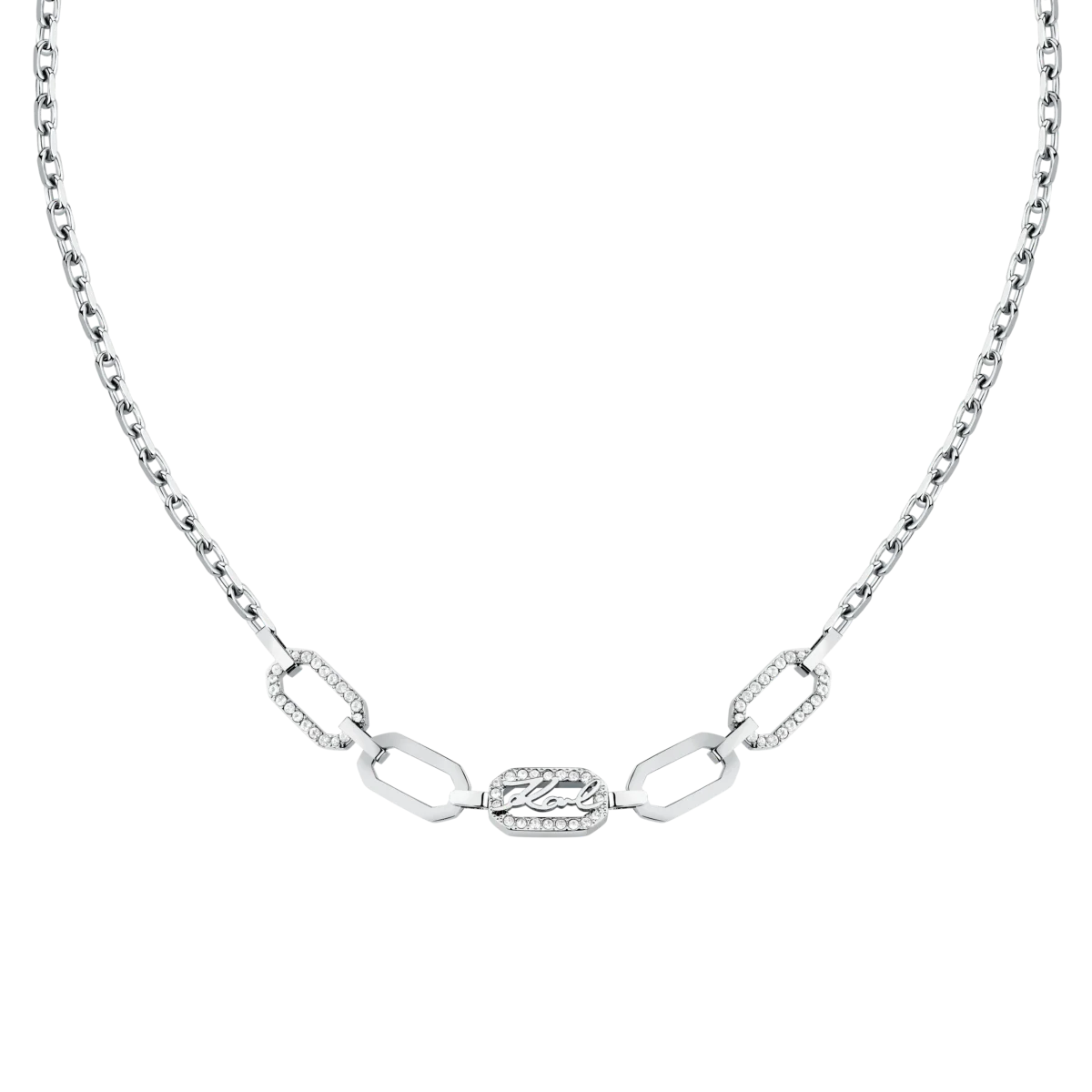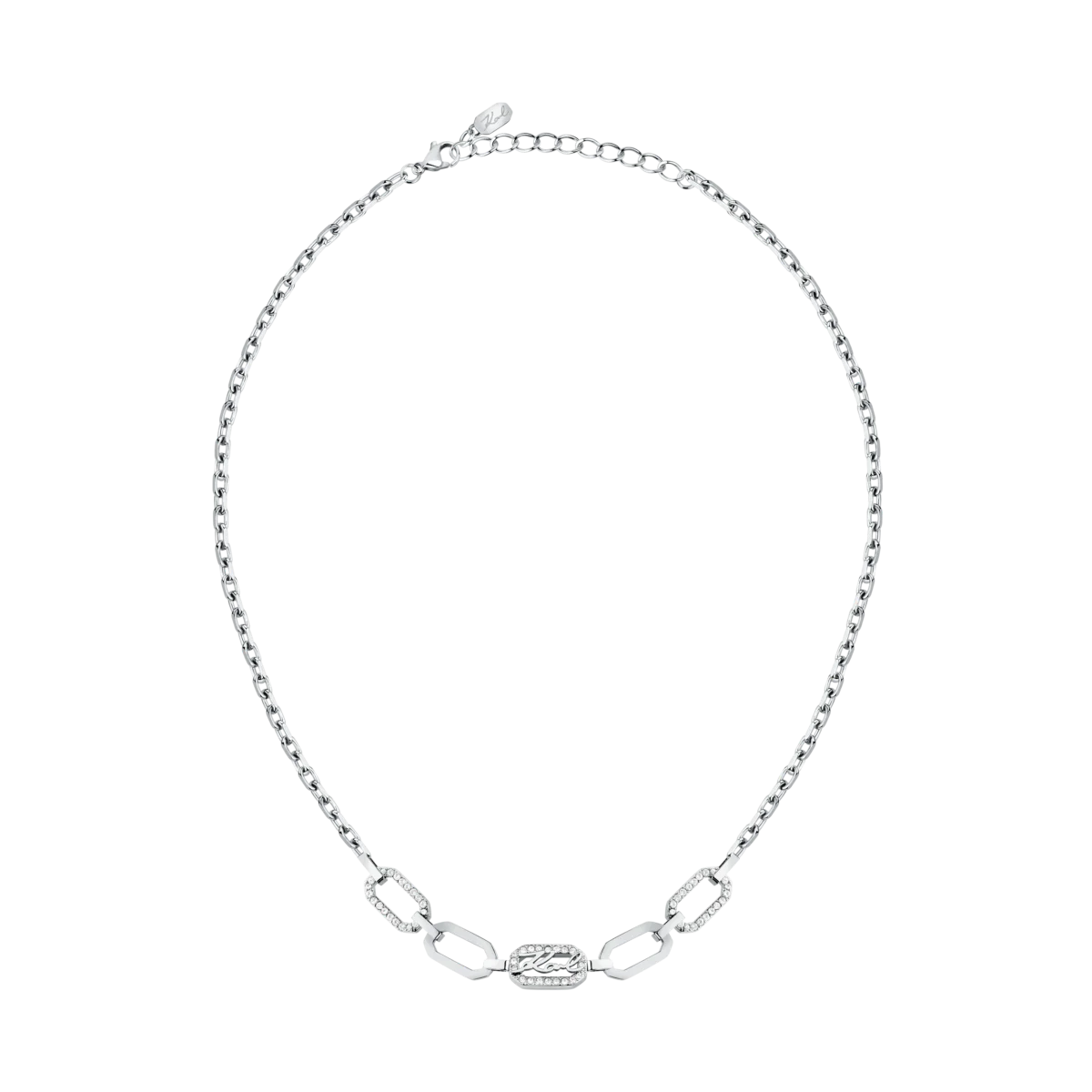 Дамско колие Karl Lagerfeld Crystals, създадено да придаде изчистен, но запомнящ се блясък на всяка визия. Сребристата верижка от неръждаема стомана е украсена в предната част с три продълговати елемента, а централният е инкрустиран с множество бели кристали и стилизиран подпис Karl – дискретен знак за дизайнерски произход.
