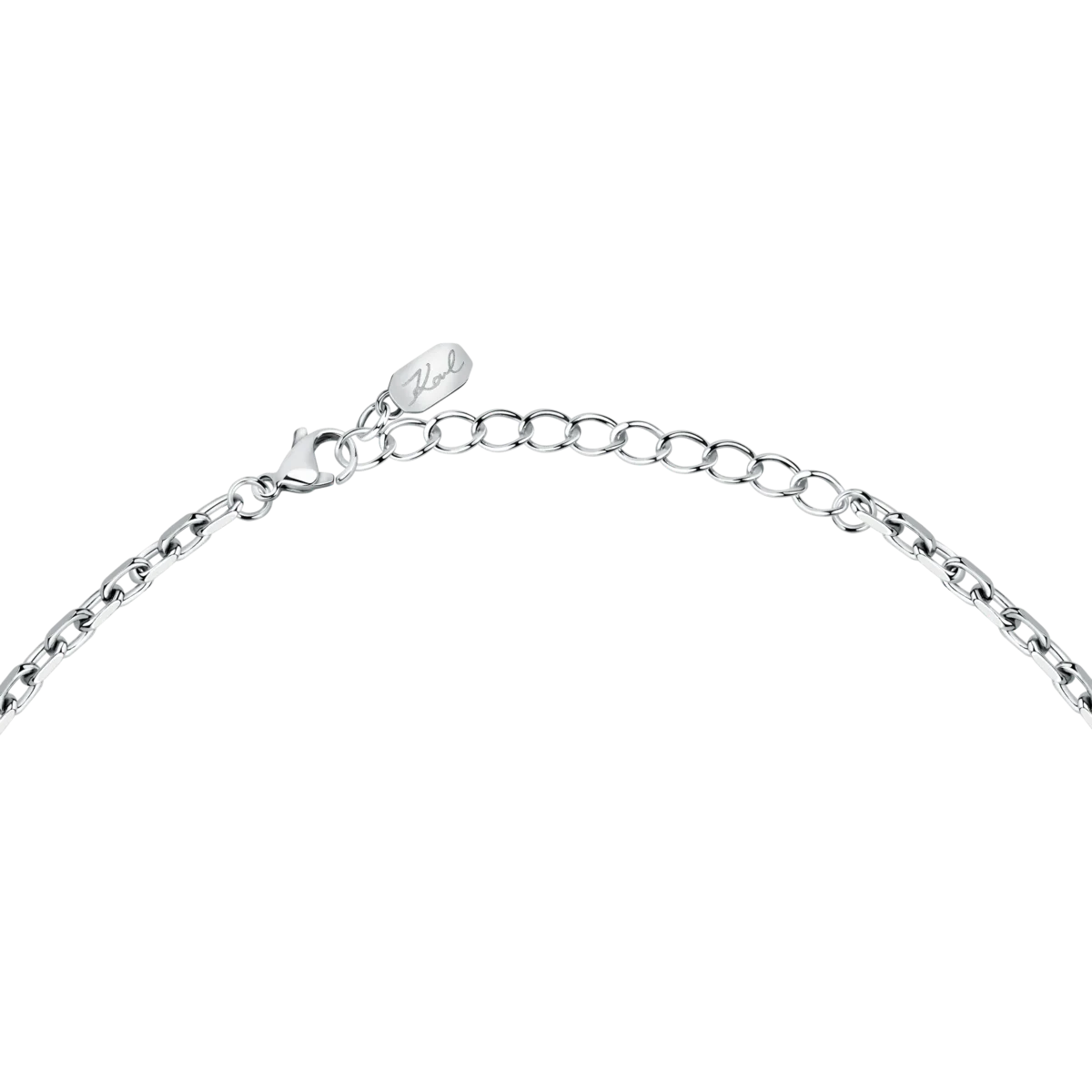 Дължината 40 + 5 см позволява регулиране според деколтето – от по-къс, почти чокър ефект, до класическа дължина около ключицата. Закопчаването е тип карабинка с удължителна верижка и малка плочка с логото Karl Lagerfeld, която завършва деликатно силуета. С тегло около 12 г, колие е достатъчно плътно, за да се усеща като качествено бижу, но остава удобно за целодневно носене.