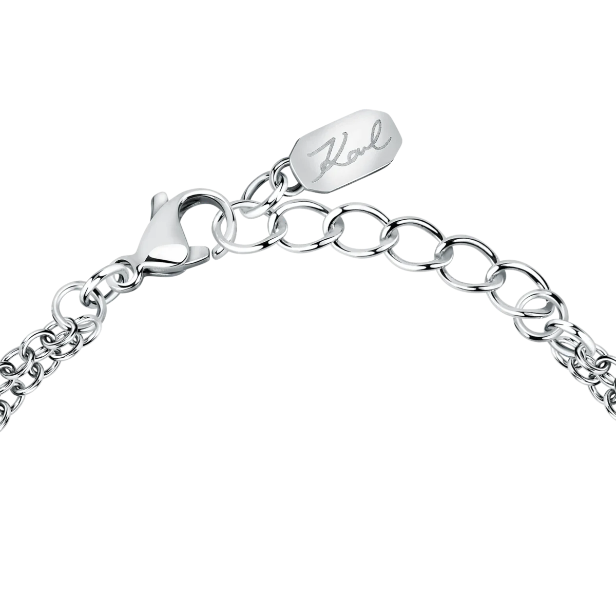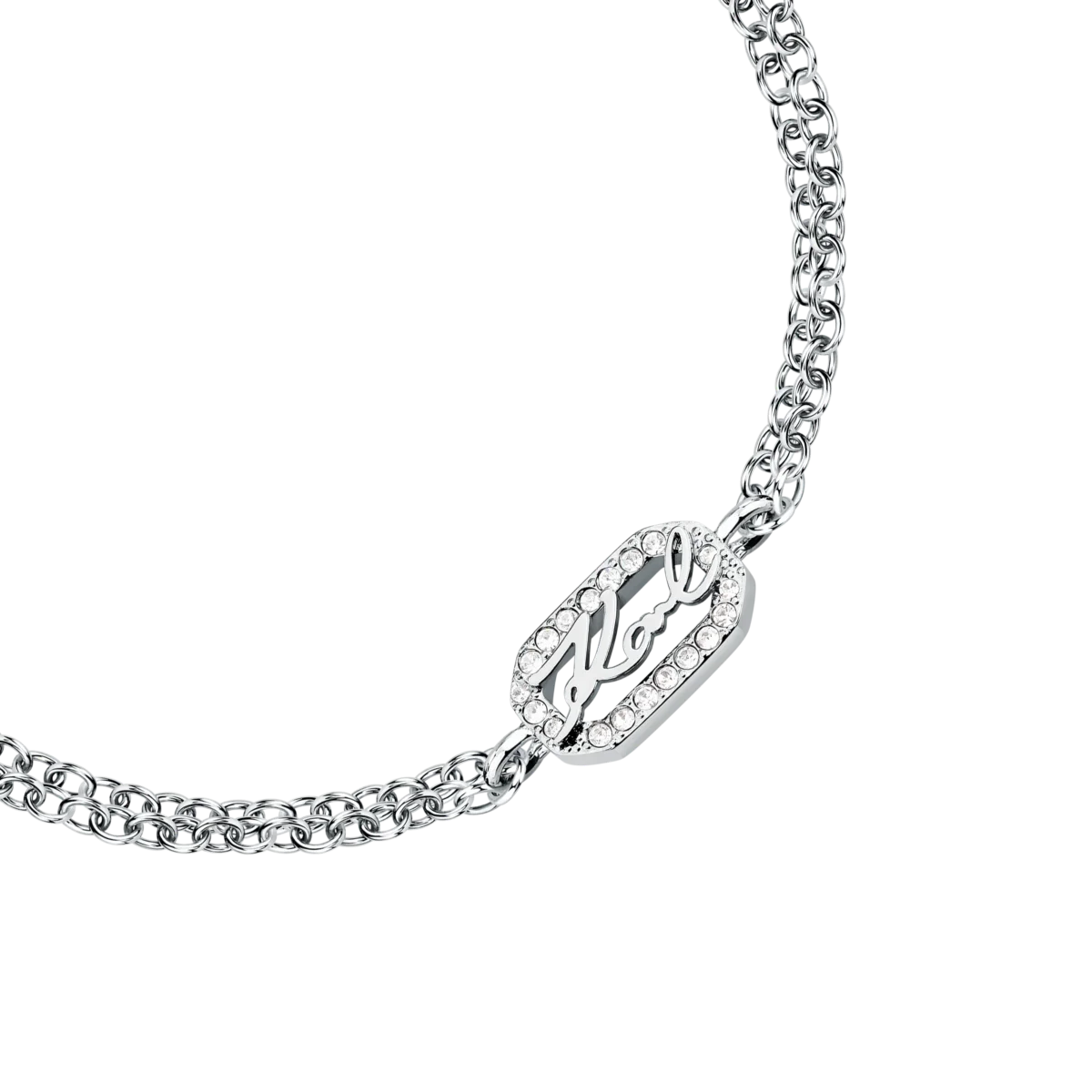- Дизайн: двойна верижка с централен правоъгълен елемент „Karl“, обрамчен с кристали.