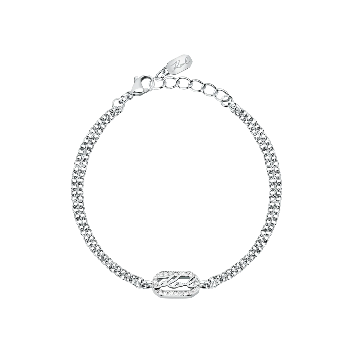 Дамската гривна Karl Lagerfeld Crystals KLAYC33 е фин, но впечатляващ акцент, който добавя блясък към всеки аутфит. Двойната сребриста верижка деликатно приляга около китката, а в центъра стои правоъгълен елемент с изрязан надпис „Karl“, обрамчен от ред бели кристали.