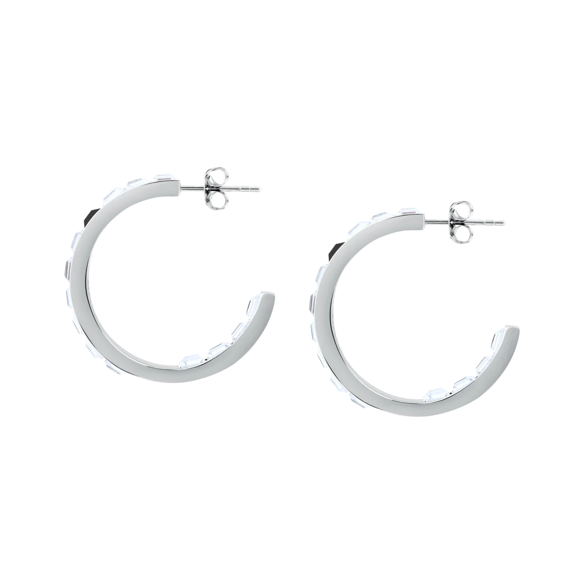 Моделът е изработен от неръждаема стомана 316L в сребрист тон – издръжлив, хипоалергенен материал, който запазва блясъка си дори при често носене. Кристалите са вградени по целия външен ръб на халката, така че обеците да блестят както отпред, така и в профил. Гладката вътрешна линия и умереното тегло около 12,2 г осигуряват комфорт при целодневно носене.