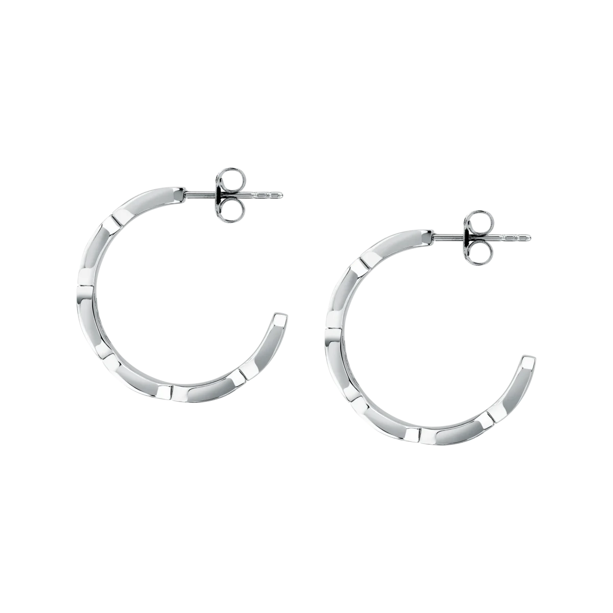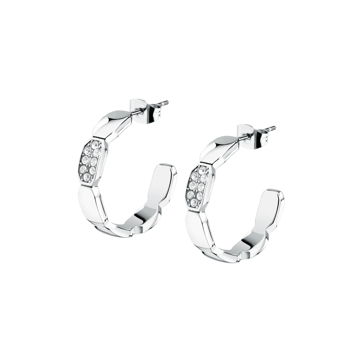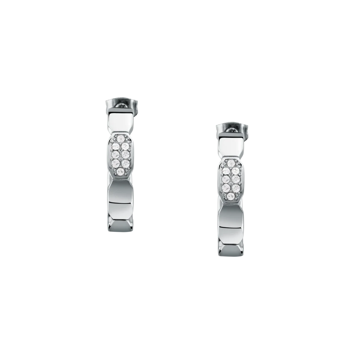 Дамските обеци Karl Lagerfeld Crystals KLAYC66 са модерна интерпретация на класическите халки. Изчистената геометрична форма напомня луксозна метална гривна, а в горната част блести правоъгълен елемент, инкрустиран с редица бели кристали – деликатен, но силно ефектен акцент.