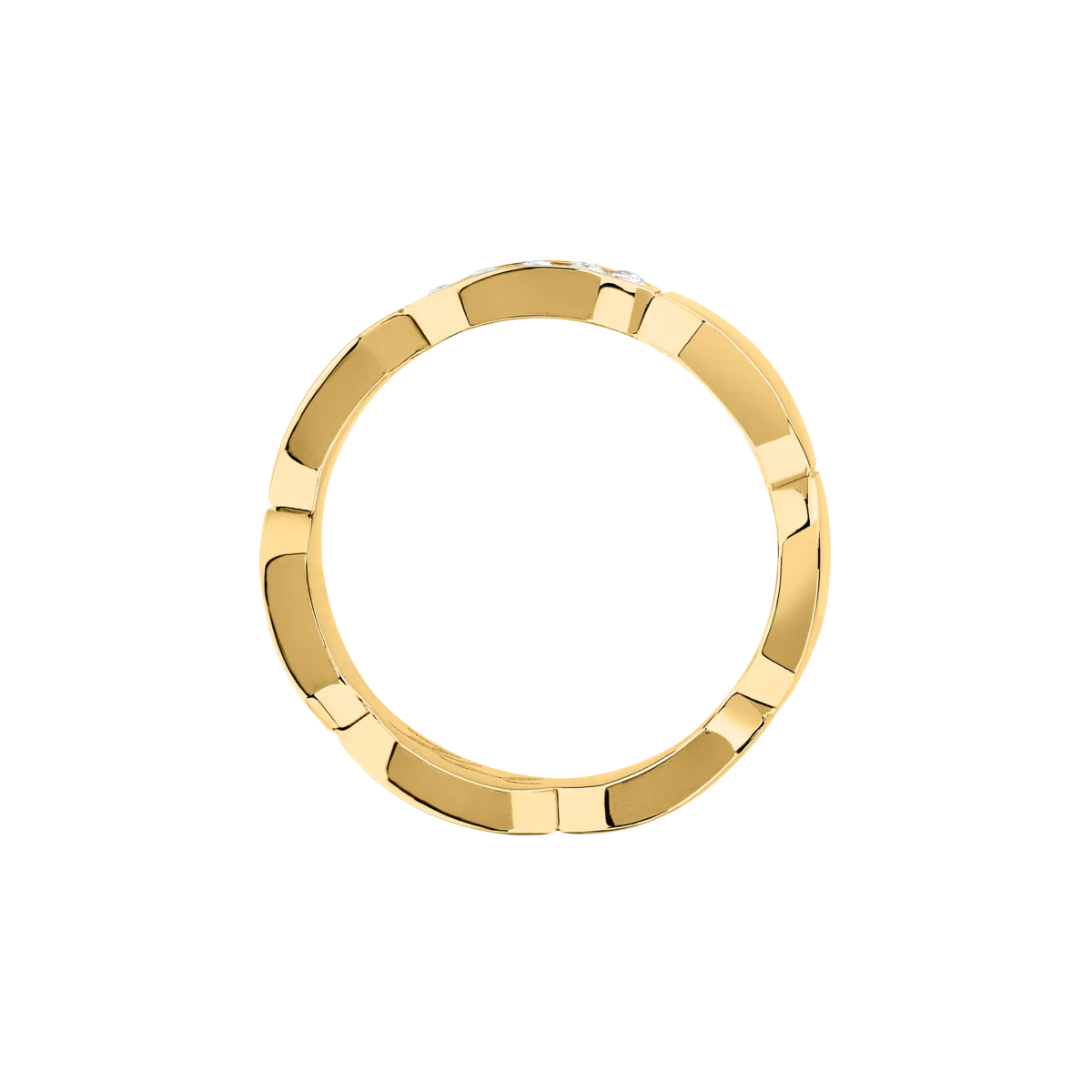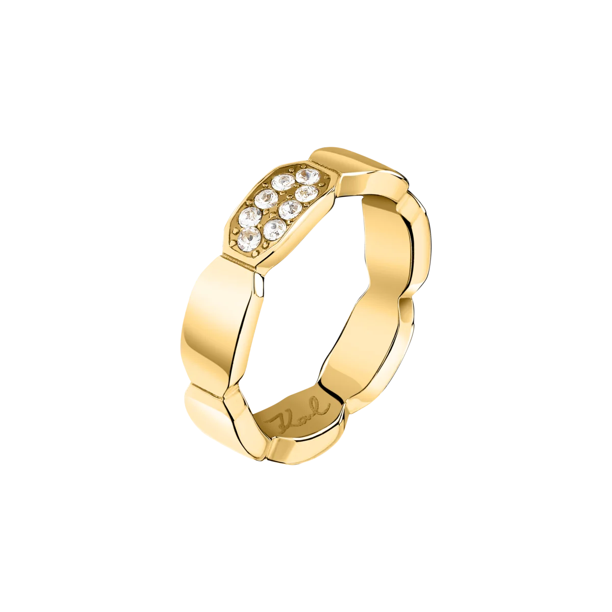 Дамският пръстен Karl Lagerfeld Crystals KLAYC62012 е създаден като изискан акцент за всеки ден. Дизайнът напомня на фин златист пръстен тип гривна – халката е оформена от малки геометрични звена, а горната част е декорирана с поле от бели кристали, които придават блясък при всяко движение на ръката.