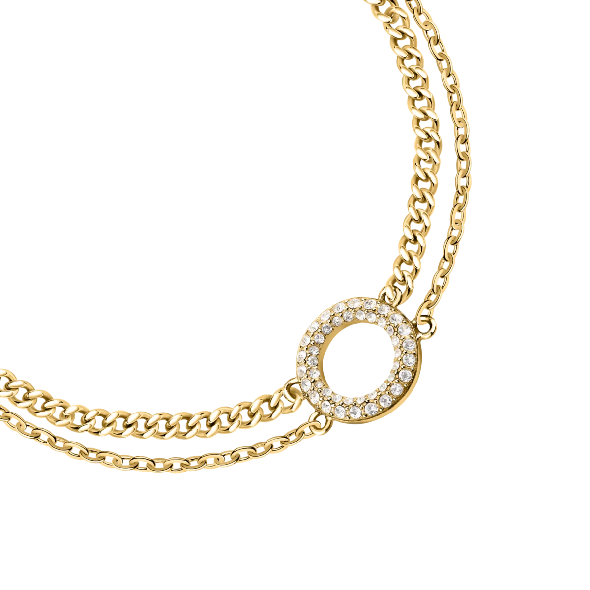 Дамската гривна Karl Lagerfeld Crystals KLAYC56 е стилен акцент за китката, който комбинира модерна верижка с изискан блясък. Двата фини синджира се събират в центъра в кръгъл елемент, обсипан с бели кристали – детайл, който улавя светлината и придава луксозно излъчване.