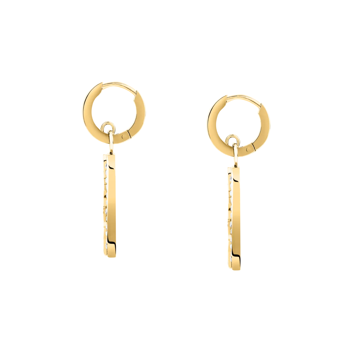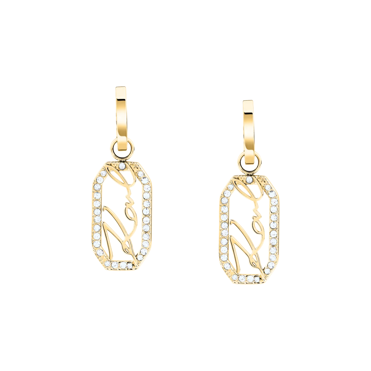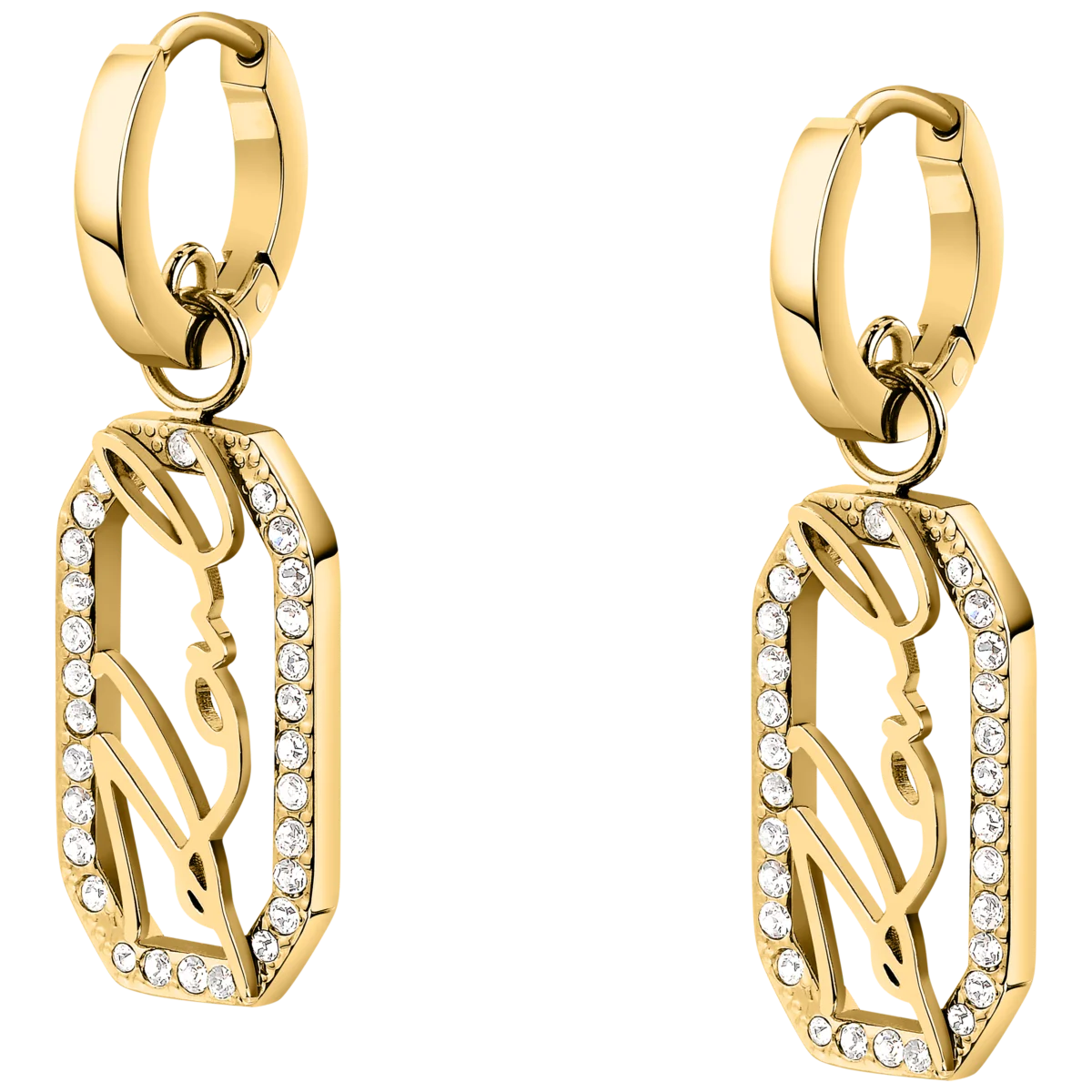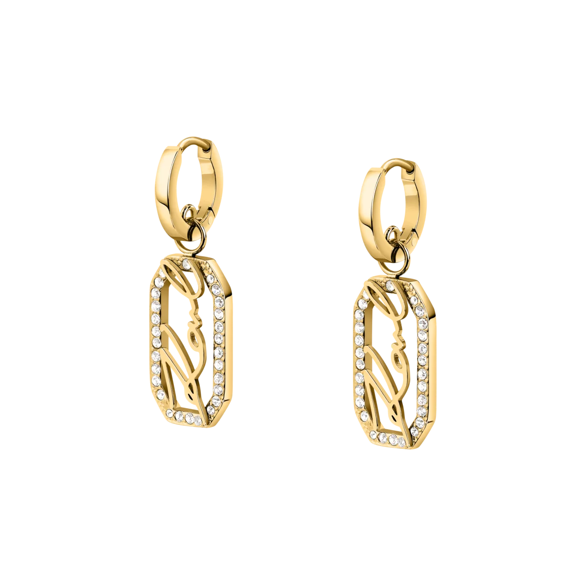 Дамските обеци Karl Lagerfeld Crystals KLAYC45 съчетават модерен логоман стил и класически блясък. Малка златиста халка прелива в правоъгълна рамка, обсипана с бели кристали, в чийто център се откроява изрязан подпис „Karl“ – истински акцент за всяка визия.