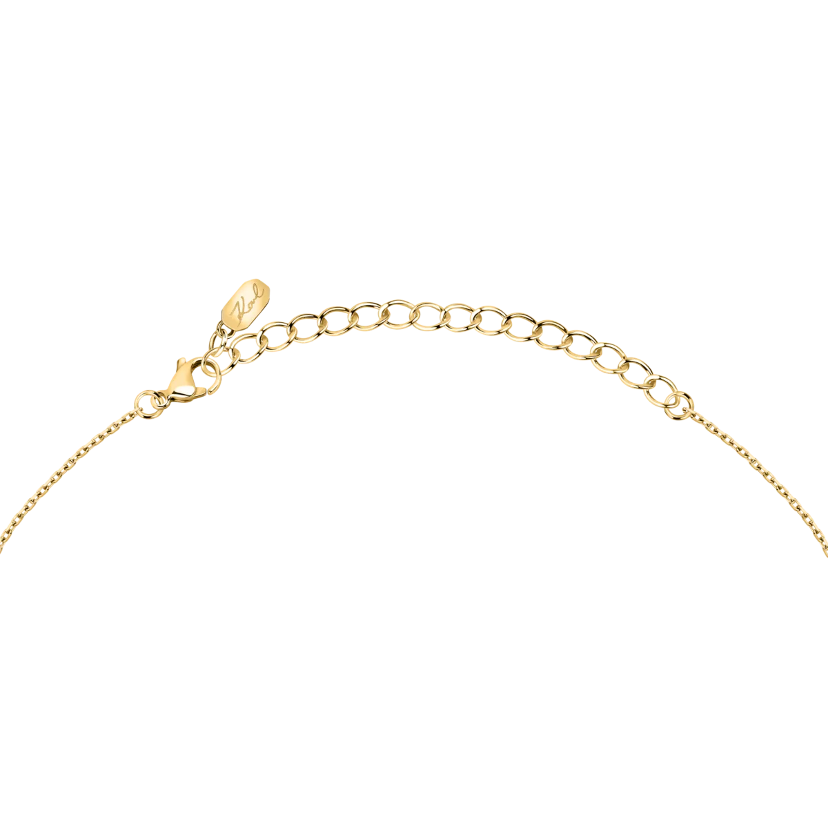 - Дизайн: фина верижка с правоъгълни кристални елементи и овален медальон с паве; страничен надпис „Karl“.