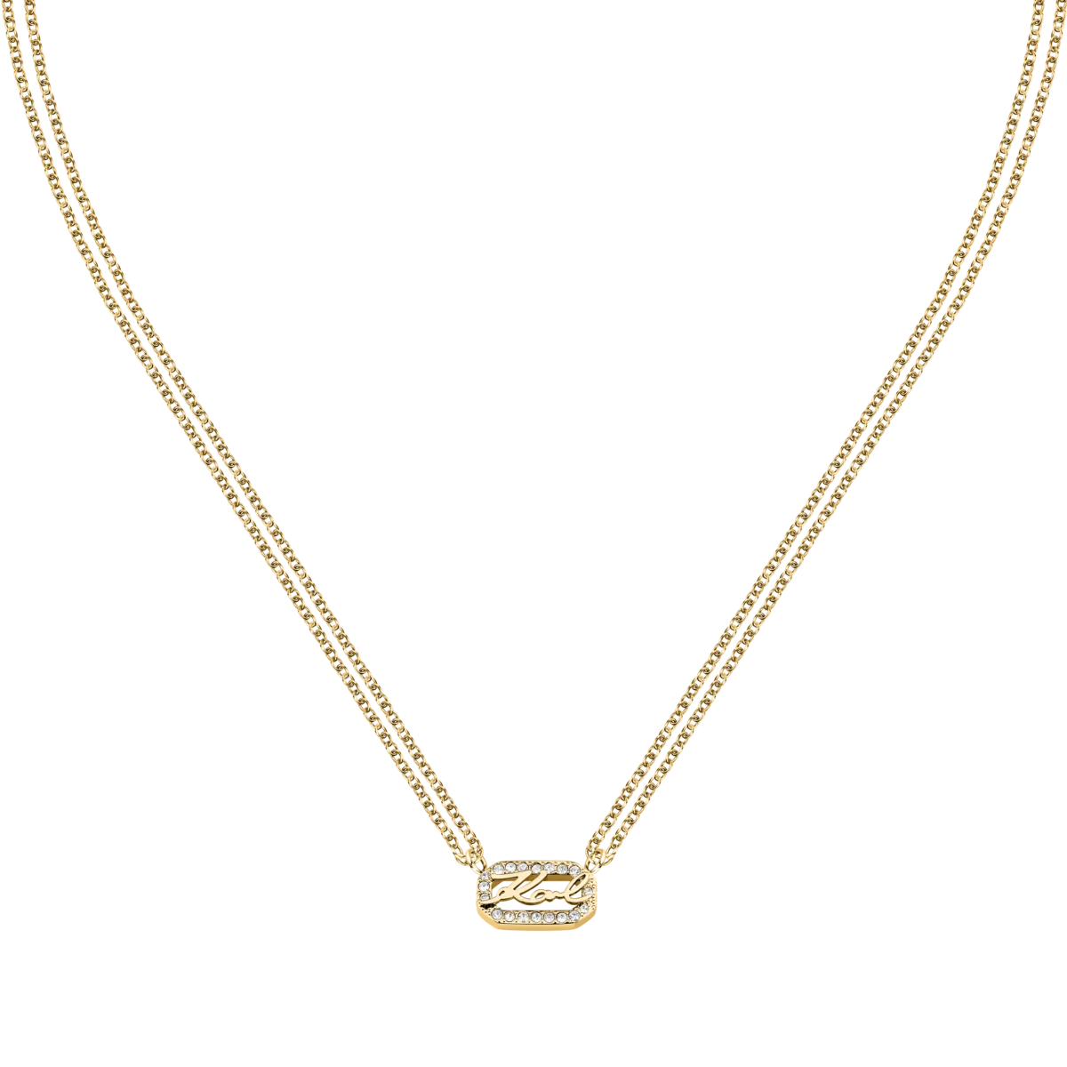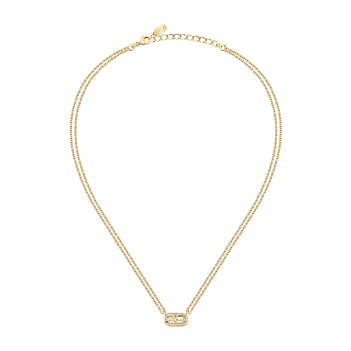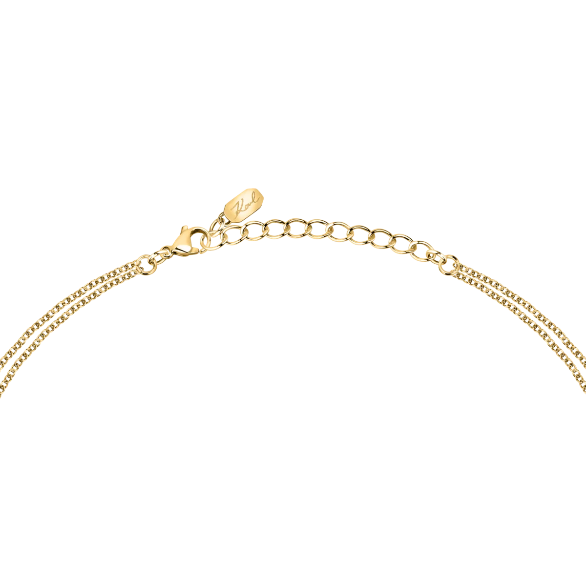 - Дизайн: двойна верижка с централен правоъгълен елемент и страничен надпис „Karl“.