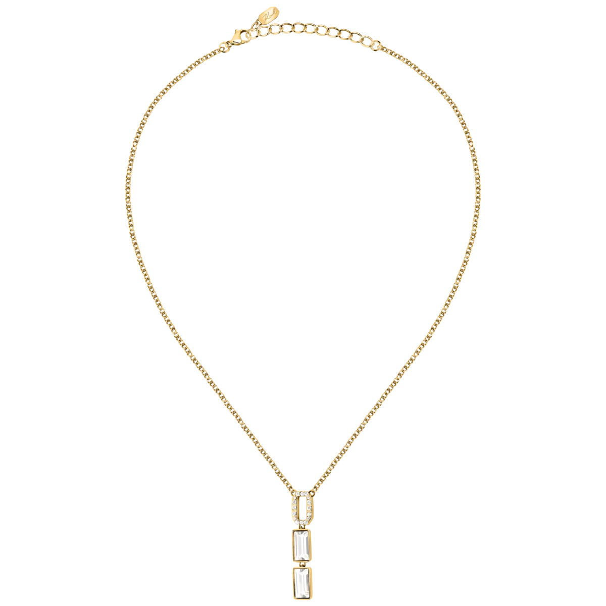 Дамско колие Karl Lagerfeld Crystals, създадено да придаде светлина и лукс на всеки силует. Фината златиста верижка пада във V-образна линия и завършва с три правоъгълни елемента – горният е обкантен с мини кристали, а двата по-дълги висулки са инкрустирани с големи прозрачни камъни тип кристал/цирконий. Ефектът е удължена, елегантна линия, която подчертава деколтето.