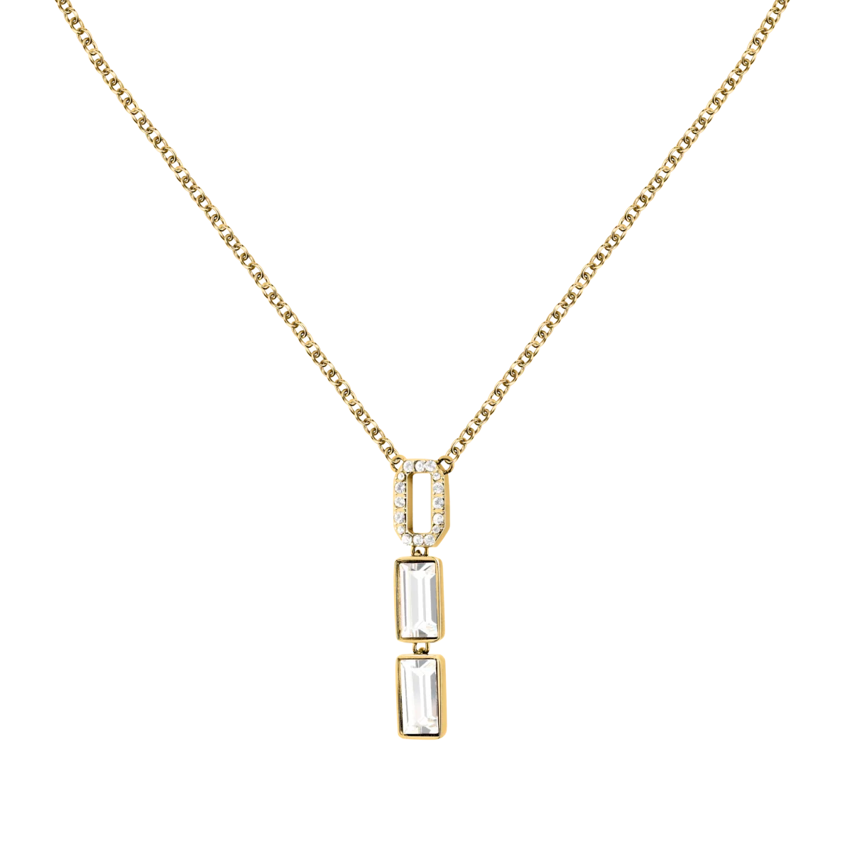 Колие е изработено от неръждаема стомана 316L с IP жълто златно покритие, което осигурява наситен цвят и по-висока устойчивост на износване от стандартната позлата. Полираният метал отразява светлината и подсилва блясъка на правоъгълните кристали, без да изглежда претрупано. Това го прави идеално за носене както с малка черна рокля, така и с изчистена риза или сатенен топ.