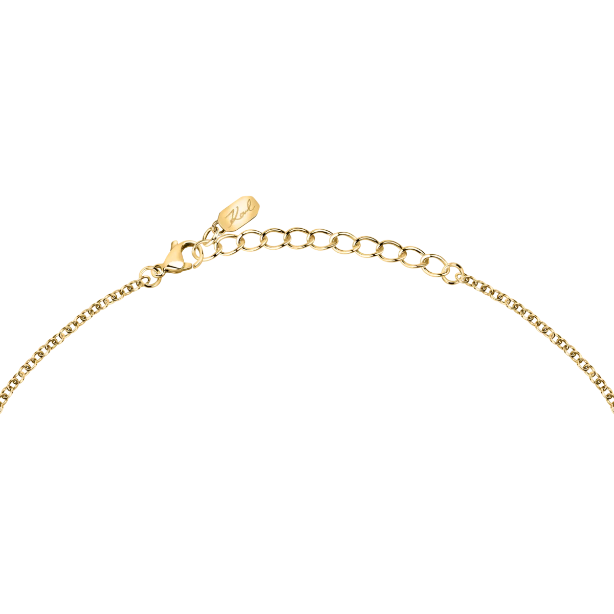 Дължината на колието е 40 + 5 см – може да се регулира с удължителната верижка, за да стои по-късо като модерно чокър колие или малко по-ниско около ключицата. Закопчаването е тип карабинка и е допълнено с малка плочка с подпис Karl, която добавя дискретен дизайнерски акцент. С тегло около 7–9 г моделът остава лек и комфортен дори при целодневно носене.