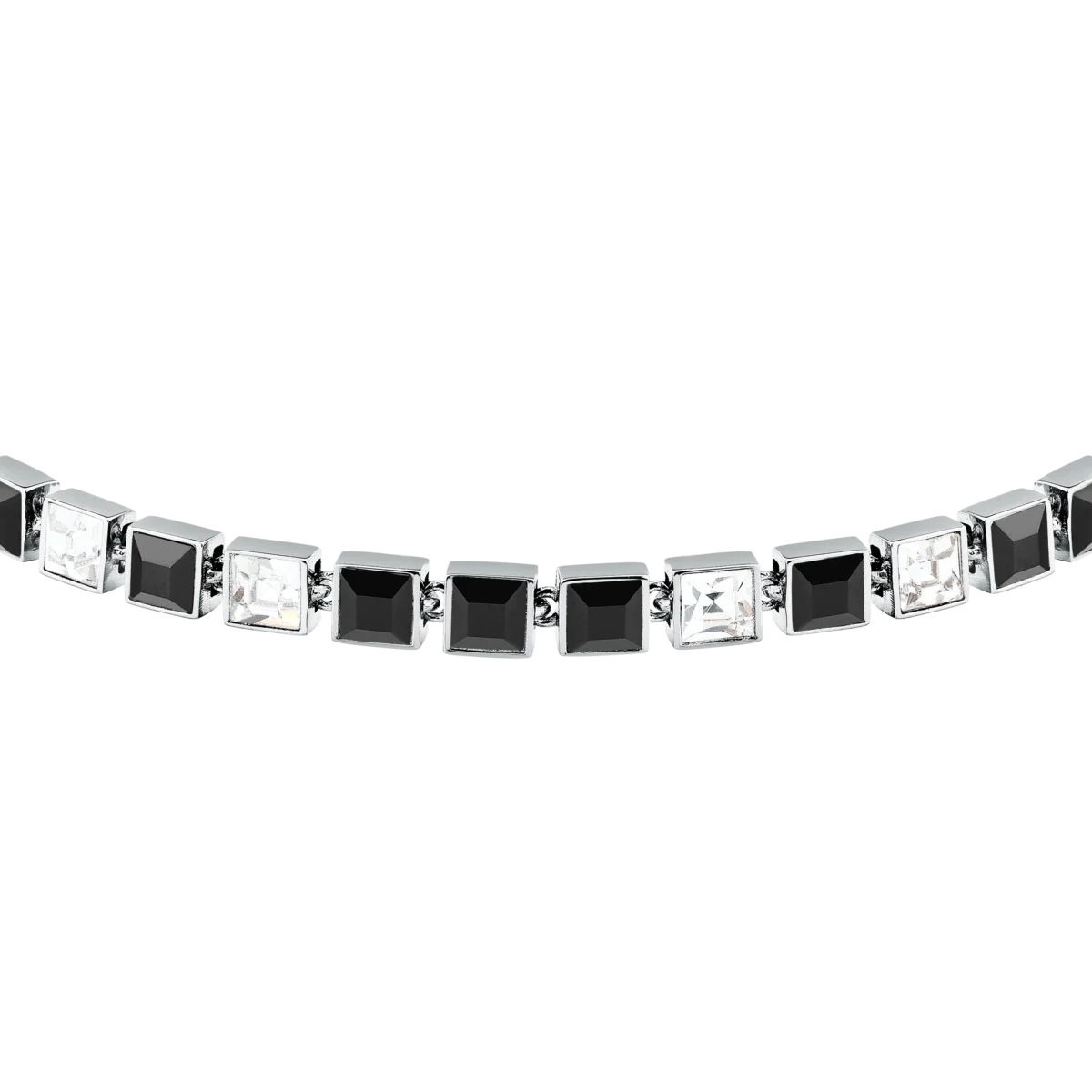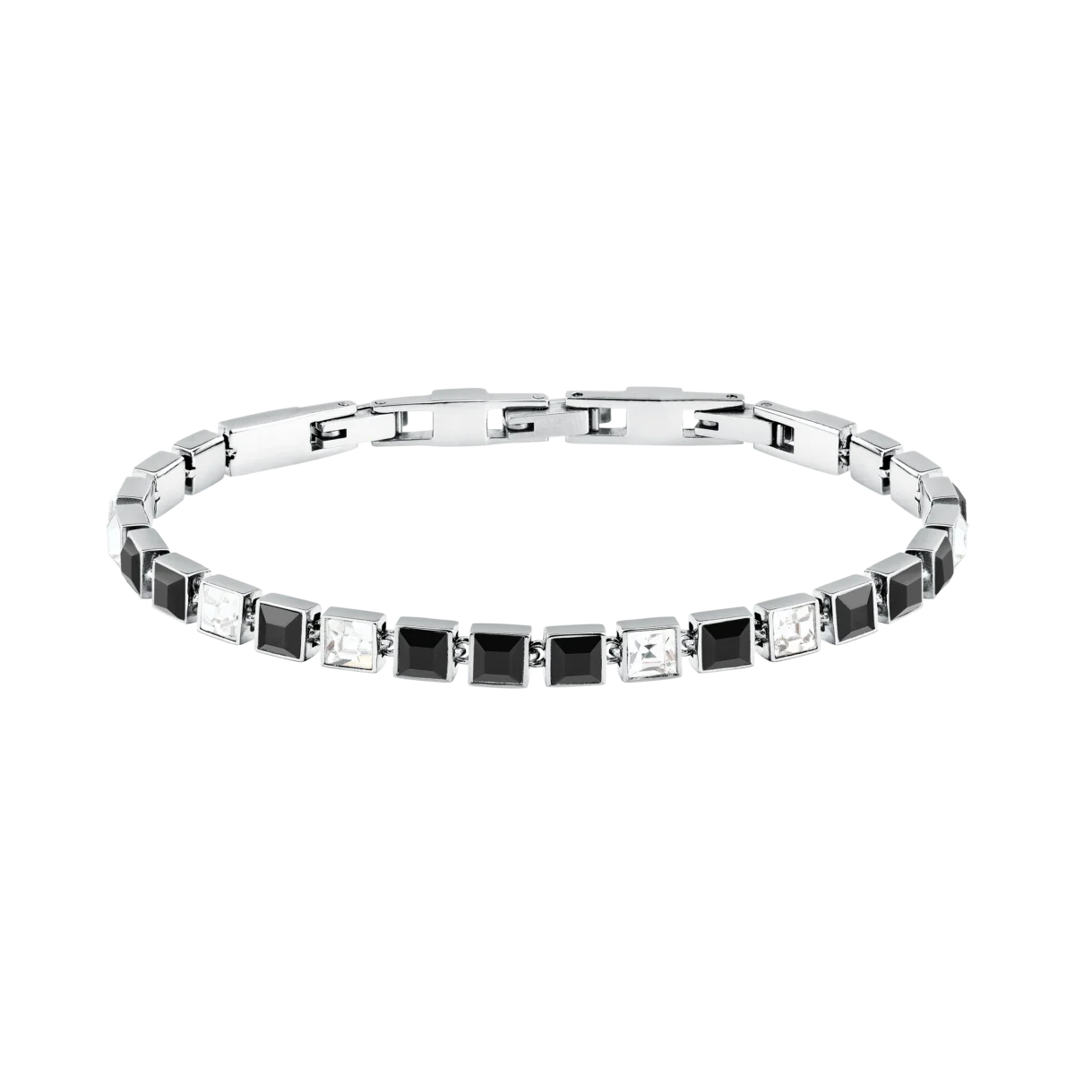Add graphic elegance to your look with the Karl Lagerfeld Crystals women's bracelet model KLAYC23. The delicate tennis bracelet made of stainless steel with a silver IP coating is adorned with alternating square white and black zirconia crystals that catch the light with every movement.