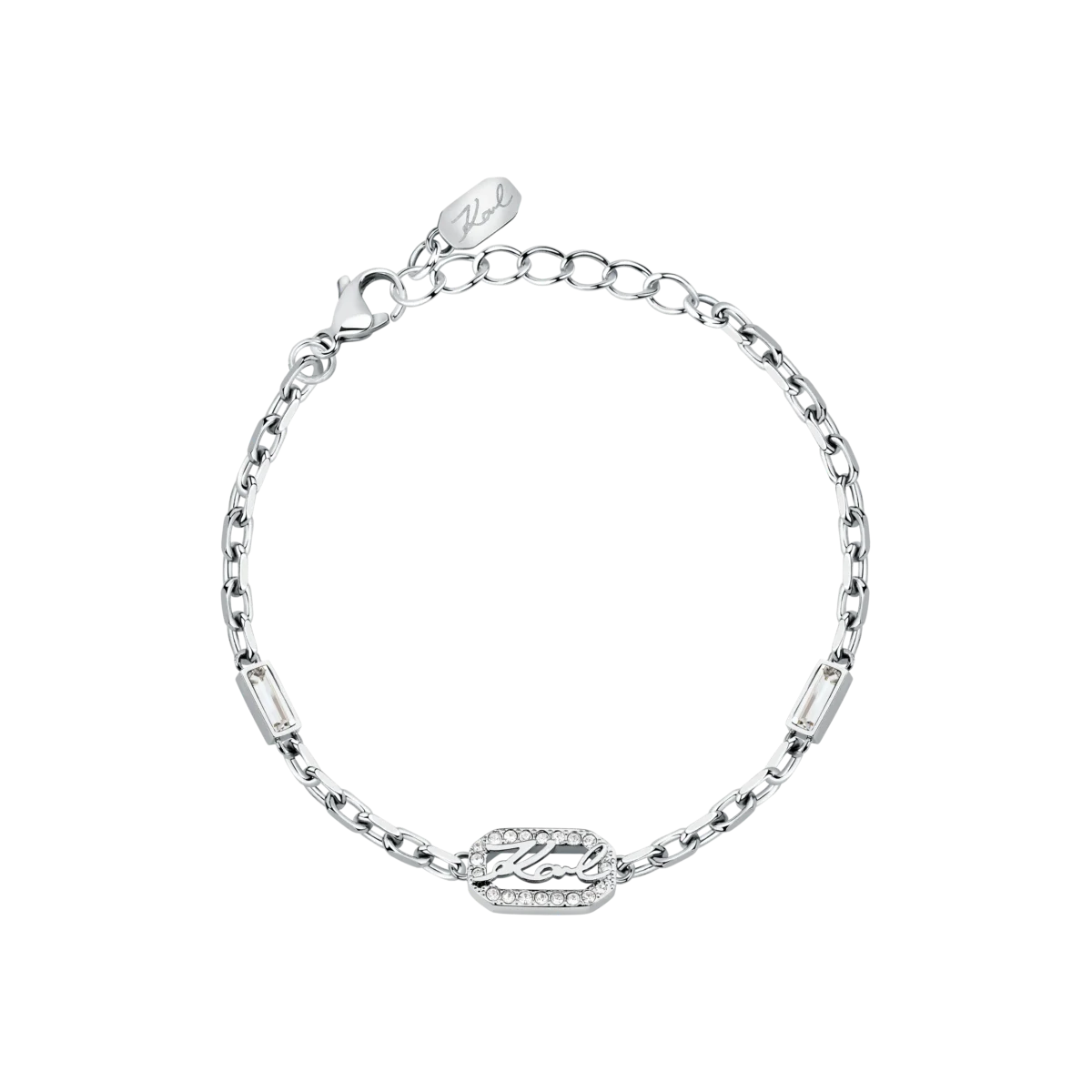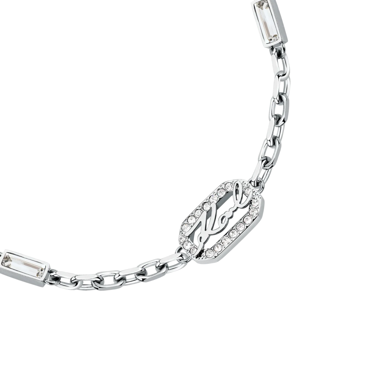 Елегантният правоъгълен медальон с pavé кристали придава изискано излъчване, а леко индустриалната верижка внася градски характер – типична комбинация за марката Karl Lagerfeld. Гривната е достатъчно деликатна за ежедневието, но и достатъчно впечатляваща, за да завърши официална визия или вечерен тоалет.