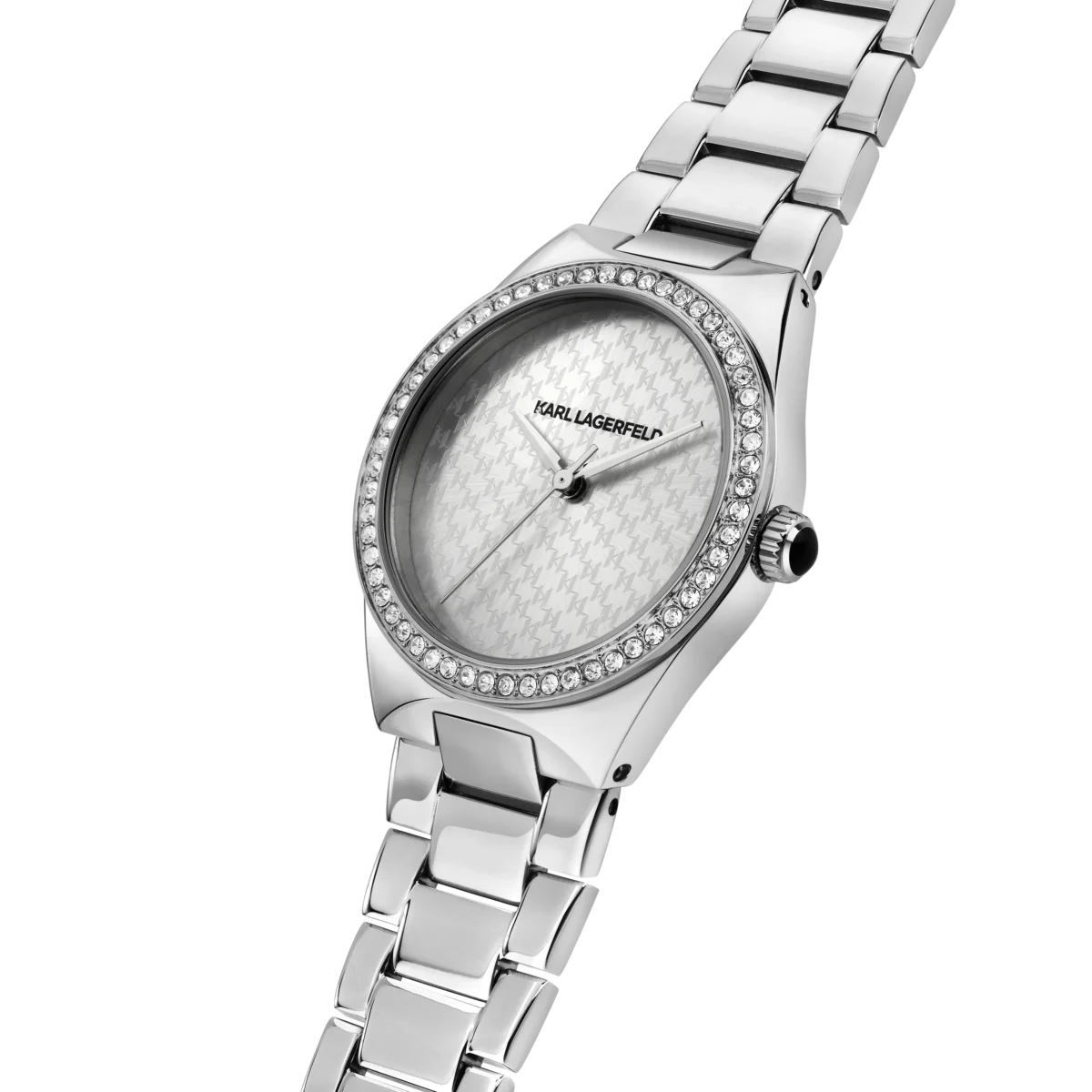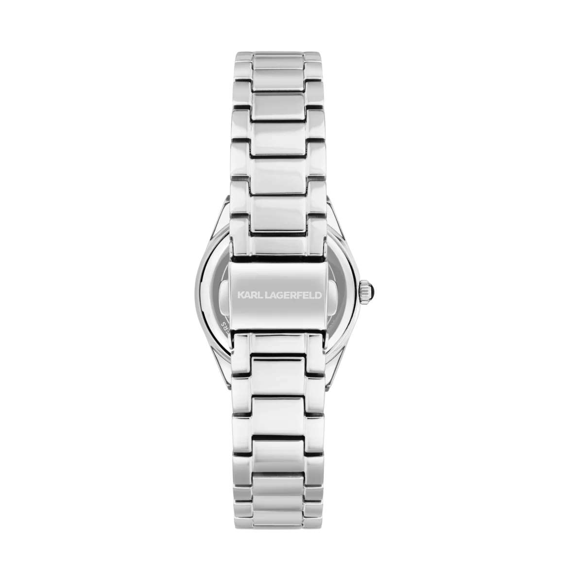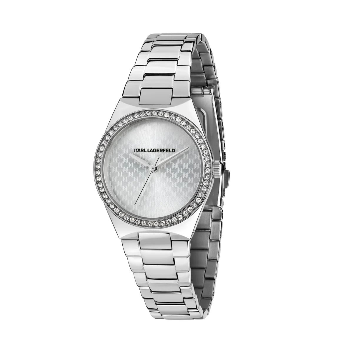 Дамският часовник KARL LAGERFELD Hamburg комбинира минималистичен силует с бижутерийна линия от кристали. Кръглият корпус 30 мм и изчистената стоманена гривна напомнят за модерна гривна, а блестящият безел обрамчва сребристия циферблат с характерния мотив на марката.