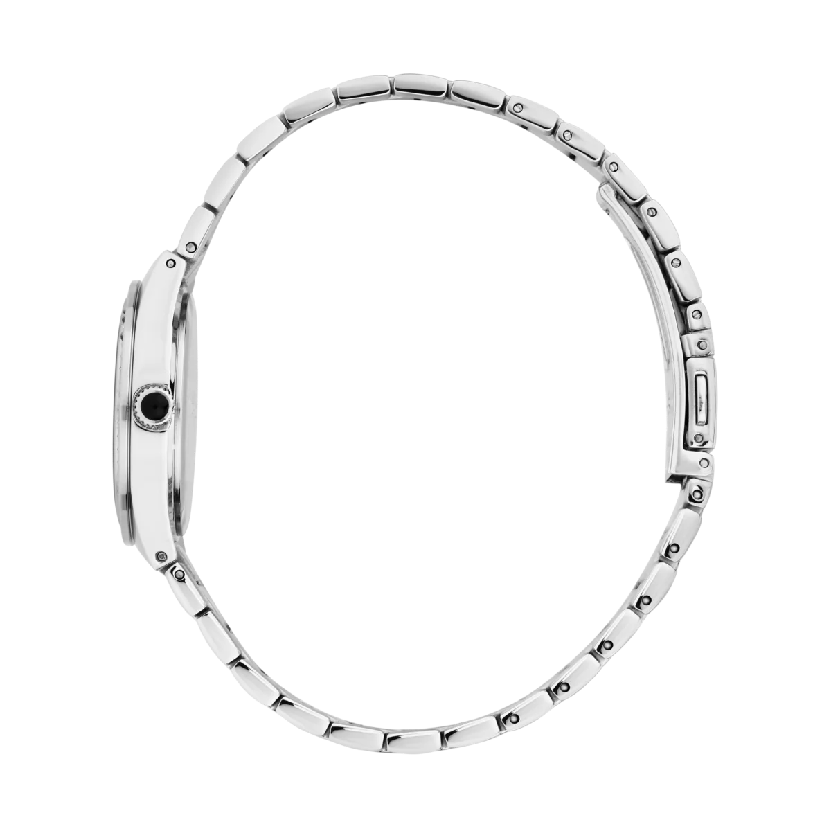 Корпусът и верижката са изработени от неръждаема стомана с PVD сребристо покритие, което придава дълбок гланц и повишава устойчивостта на цвета. Минералното стъкло защитава циферблата тип sunray със светлосребрист десен, върху който три метални стрелки подчертават изчистения, модерен стил.