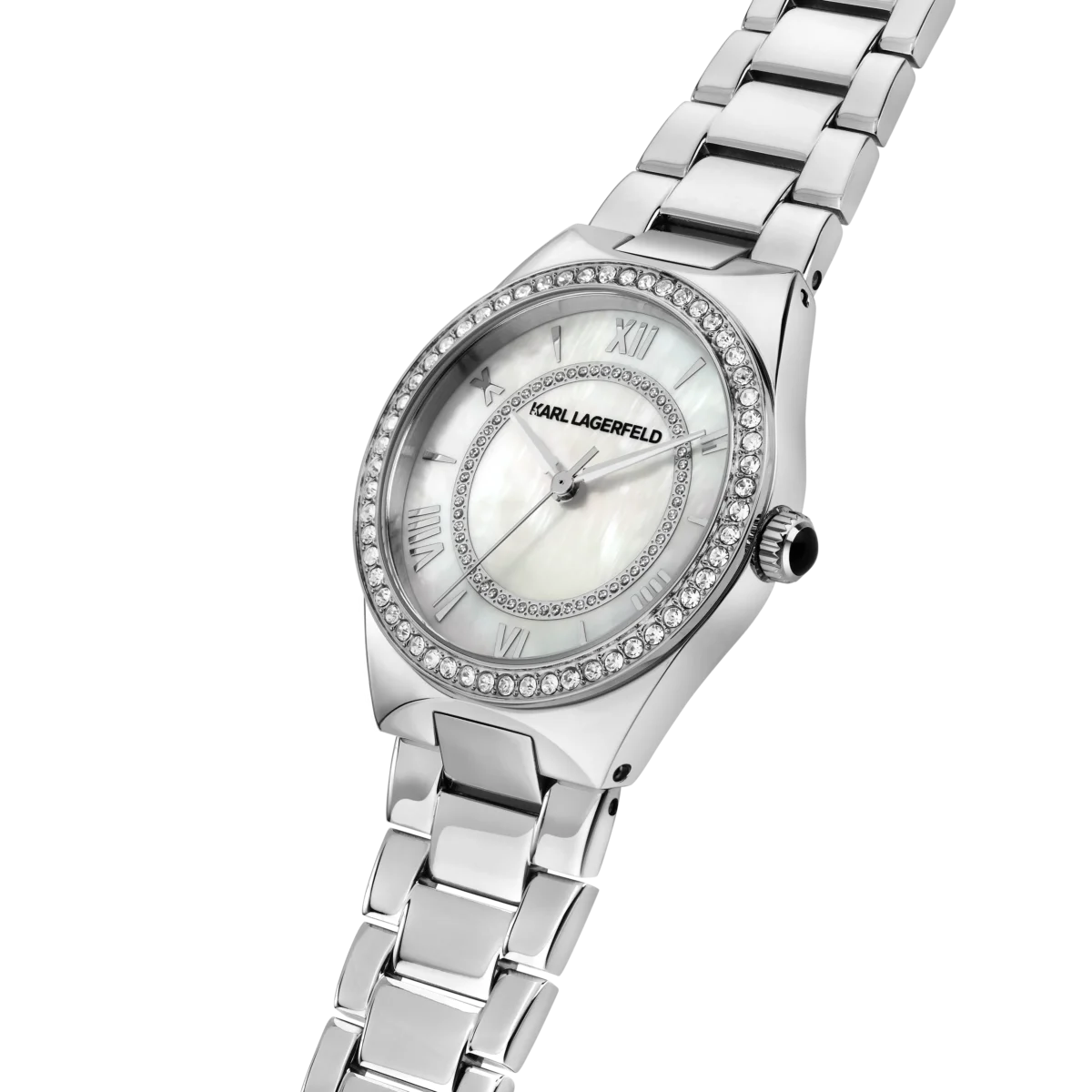 Циферблатът е от естествен бял перлен MOP, който играе с светлината и променя нюансите си от меко бяло до леко опалово. Римските индекси и вътрешният кръг от кристали добавят класическа нотка, а логото Karl Lagerfeld и елегантните стрелки завършват изчистената визия. Над него е поставено минерално стъкло, устойчиво на ежедневни надрасквания.